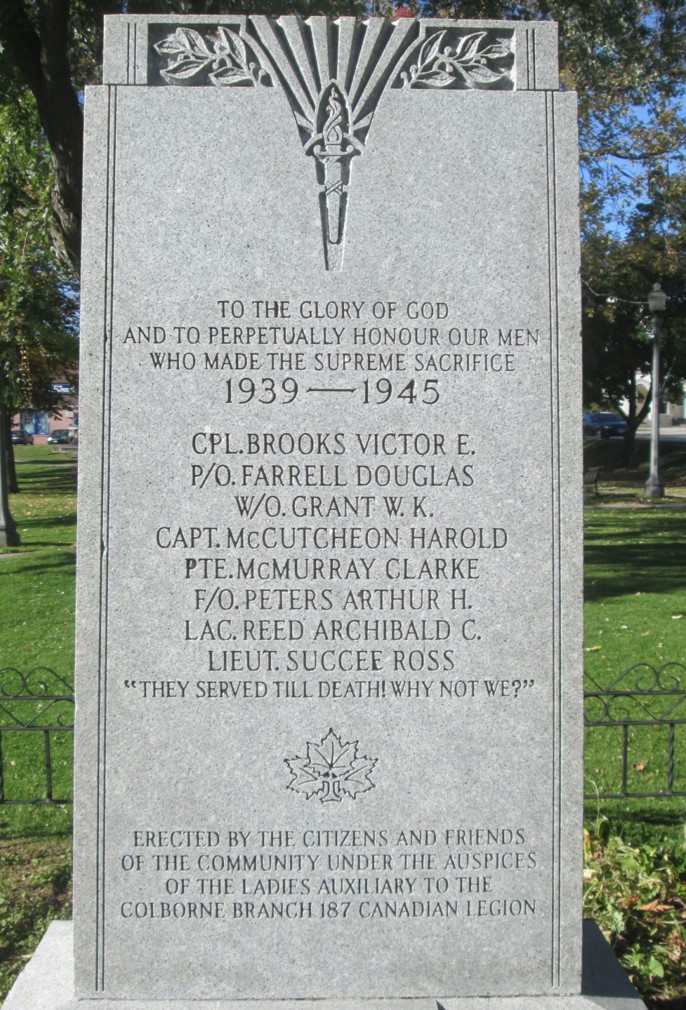 A cenotaph in memory of the local fallen of the Second World War was unveiled and dedicated on Sunday afternoon, October 24, 1948. The light grey granite stele was erected in Victoria Square Park by the Ladies’ Auxiliary of the Royal Canadian Legion Branch 187.