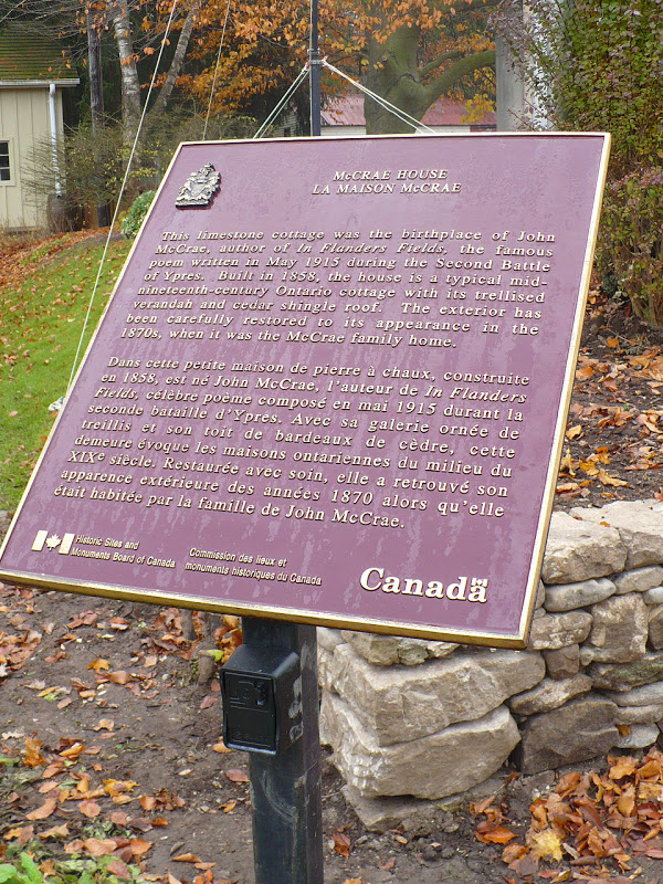 The limestone cottage located within The Colonel John McCrae Birthplace & Memorial Gardens was the birthplace of John McCrae, author of In Flanders Fields, the famous poem written in May 1915 during the Second Battle of Ypres. McCrae House was designated a national historic site of Canada in 1966 for its significance to the history of architecture; and because it is the birthplace of John McCrae.