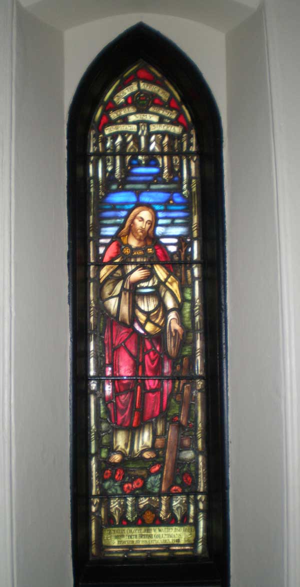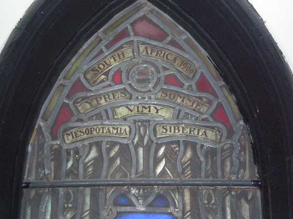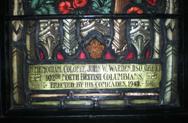 This window is a regimental tribute from the 102nd North British Columbians to one of their fallen comrades, Colonel John W. Warden, erected in 1947. The banner across the top of the window lists battles in which the regiment fought. Christ extends His hand in blessing over war graves, shown as crosses at his feet. The tree in the background has been cut down before its time. The poppies refer to Colonel John McCrae's famous First World War poem, "In Flanders Fields," which made the poppy an enduring symbol of wartime and self-sacrifice. Above Christ's head are five peace doves.