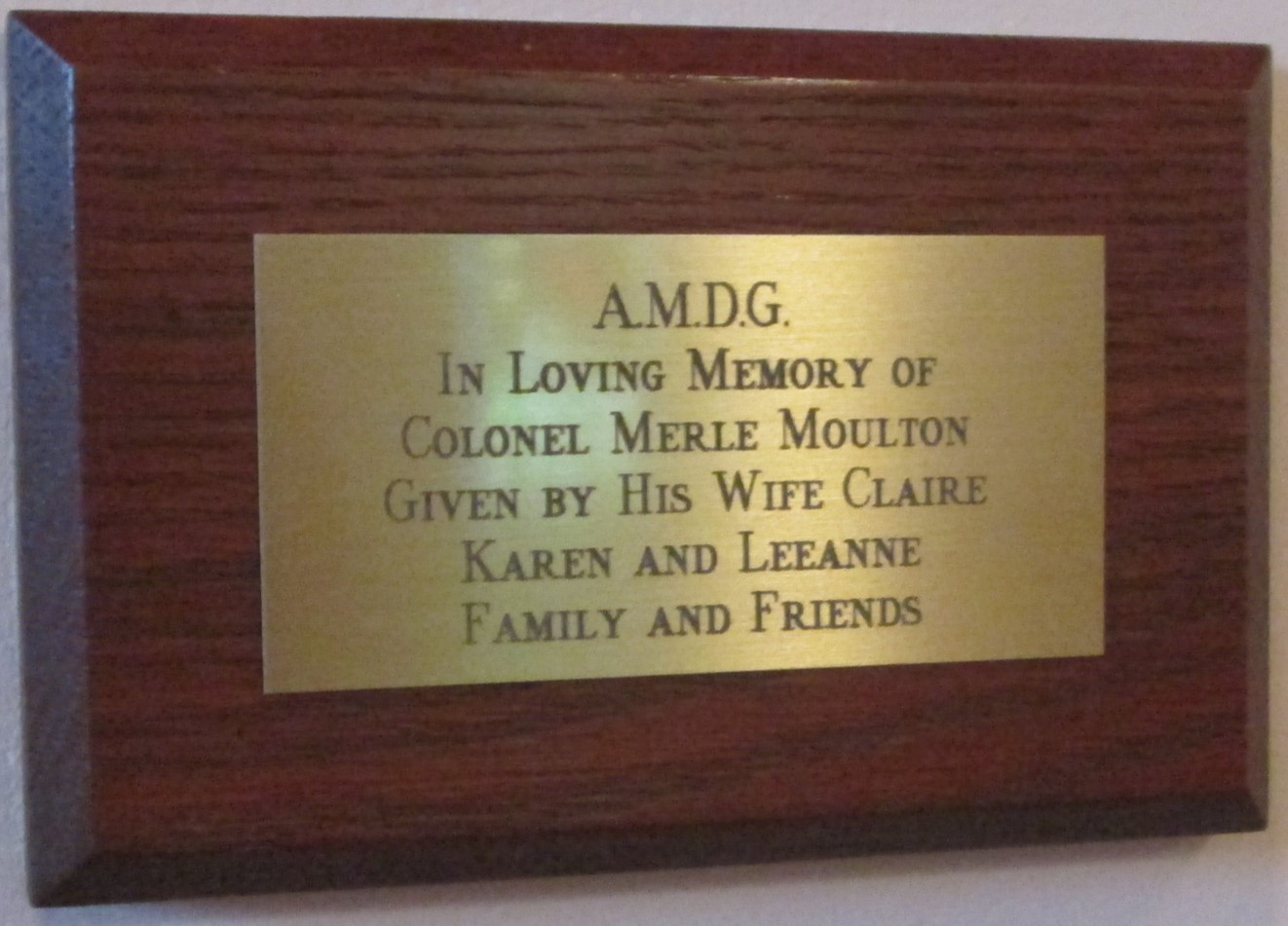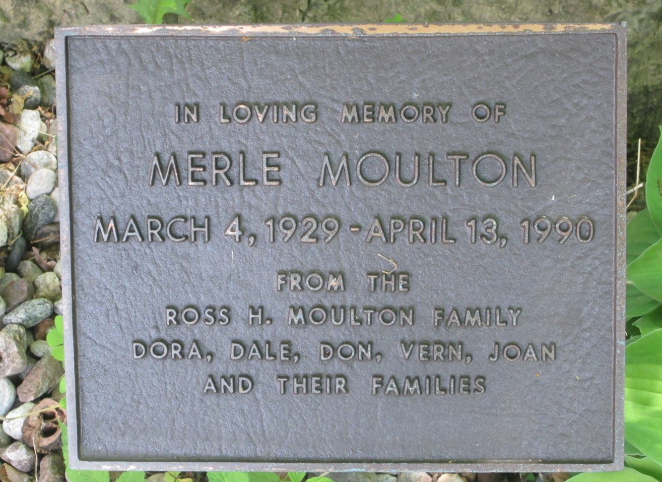 This memorial consists of three elements: a tapestry and dedication plaque, a small outdoor garden and dedication plaque, and cemetery gates and dedication plaque. This memorial is dedicated to Colonel Merle Moulton, erected by family and friends.