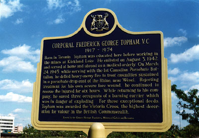 Adjacent to the Cenotaph, a provincial plaque commemorating Corporal Frederick George Topham, V.C., an Etobicoke war Hero. It was erected in 1980. Refer to memorial number 35021-001