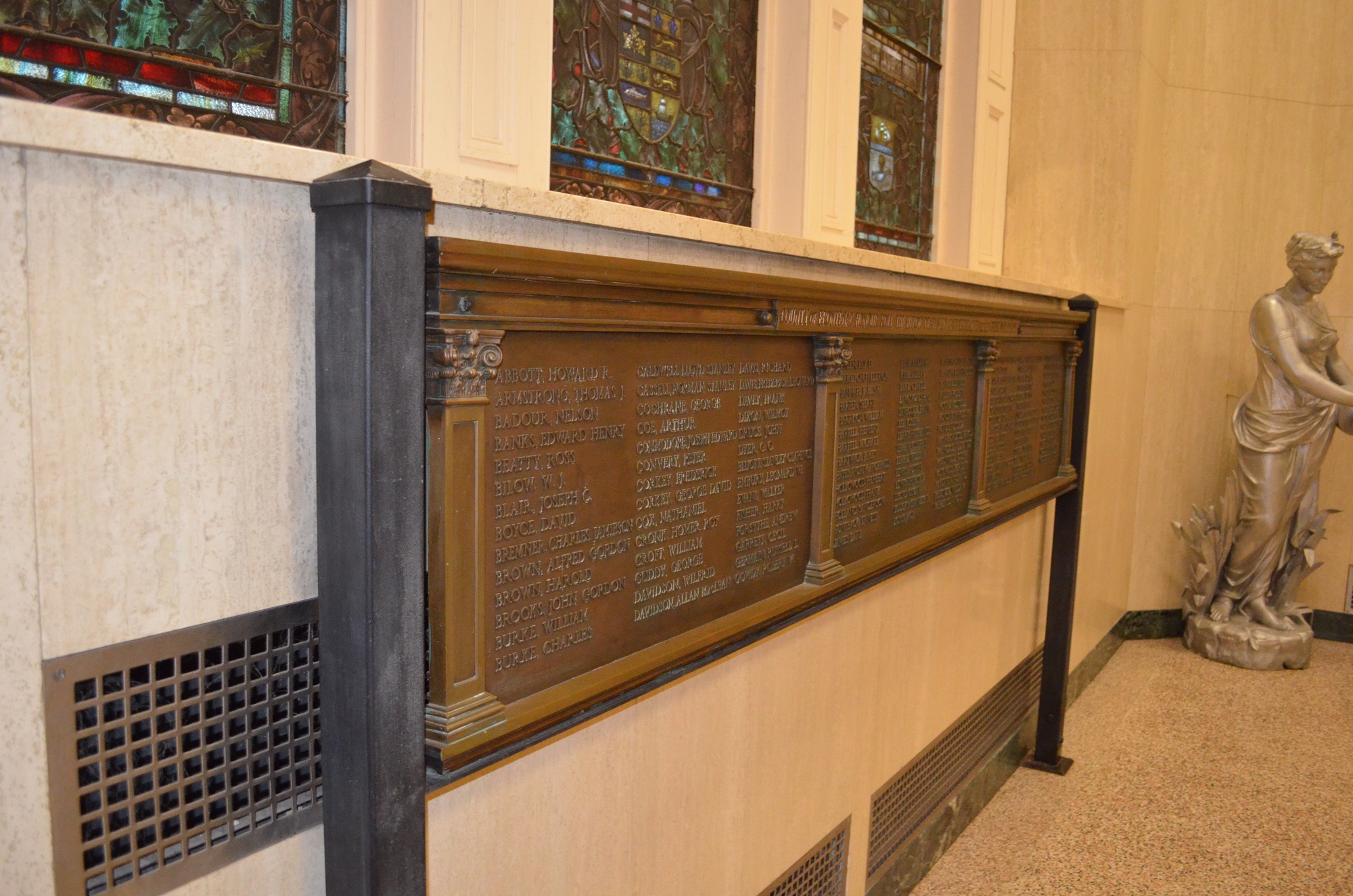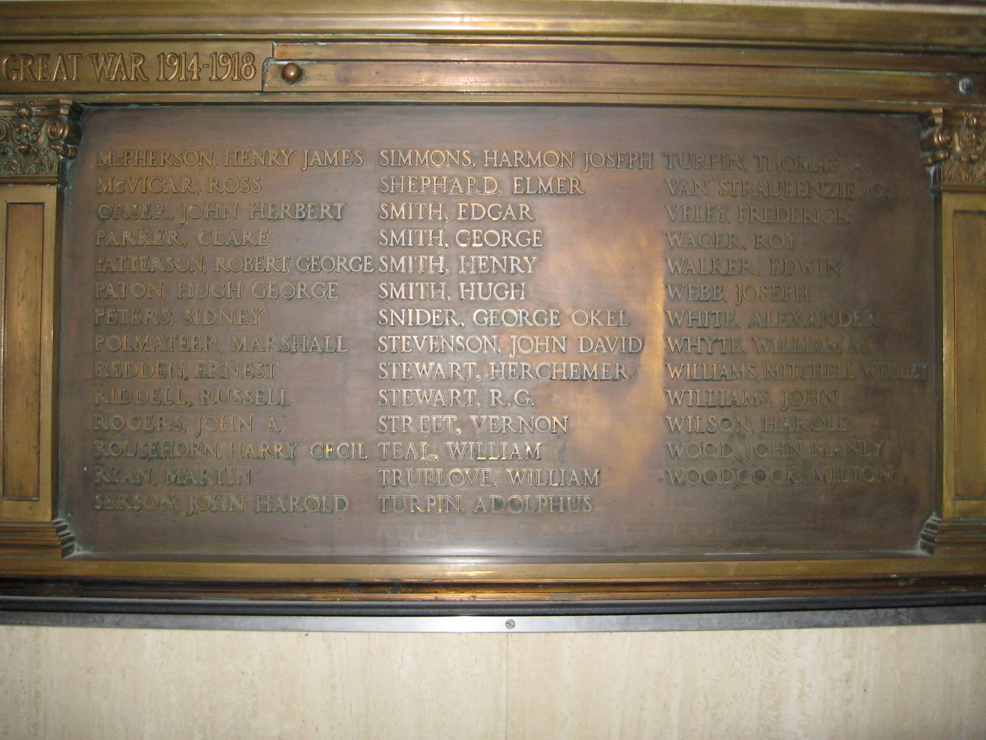 The County of Frontenac Great War Honour Roll was unveiled on November 24, 1921, by Warden Charles MacGregor and dedicated by Major (Very Reverend Dean) Starr. It is located underneath the First World War Window.