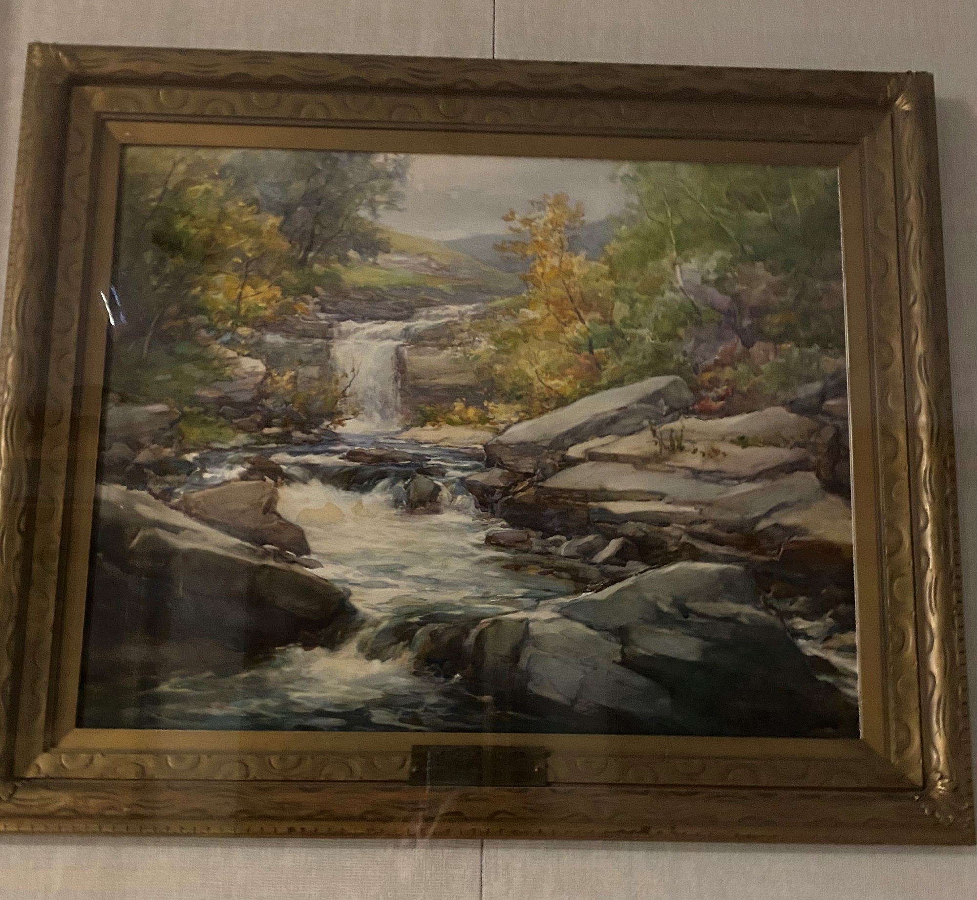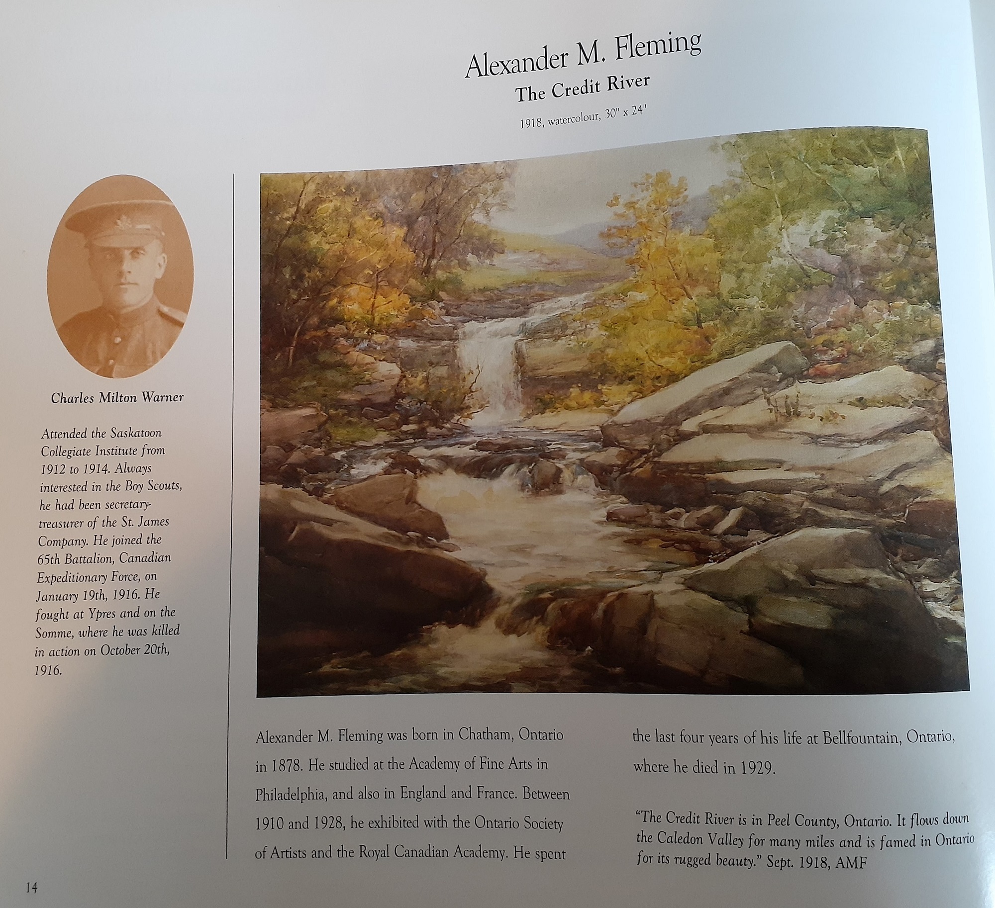Alexander M. Flemming's The Credit River was acquired in 1919 and dedicated to Private Charles Milton Warner. It is hung in the auditorium on the top floor of the school. Charles attended Saskatoon Collegiate Institute from 1912 to 1914. He enlisted on 19 January 1916 and was killed on 20 October 1916 at the Somme.