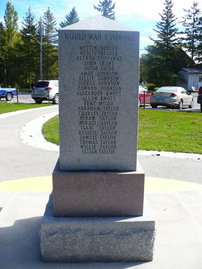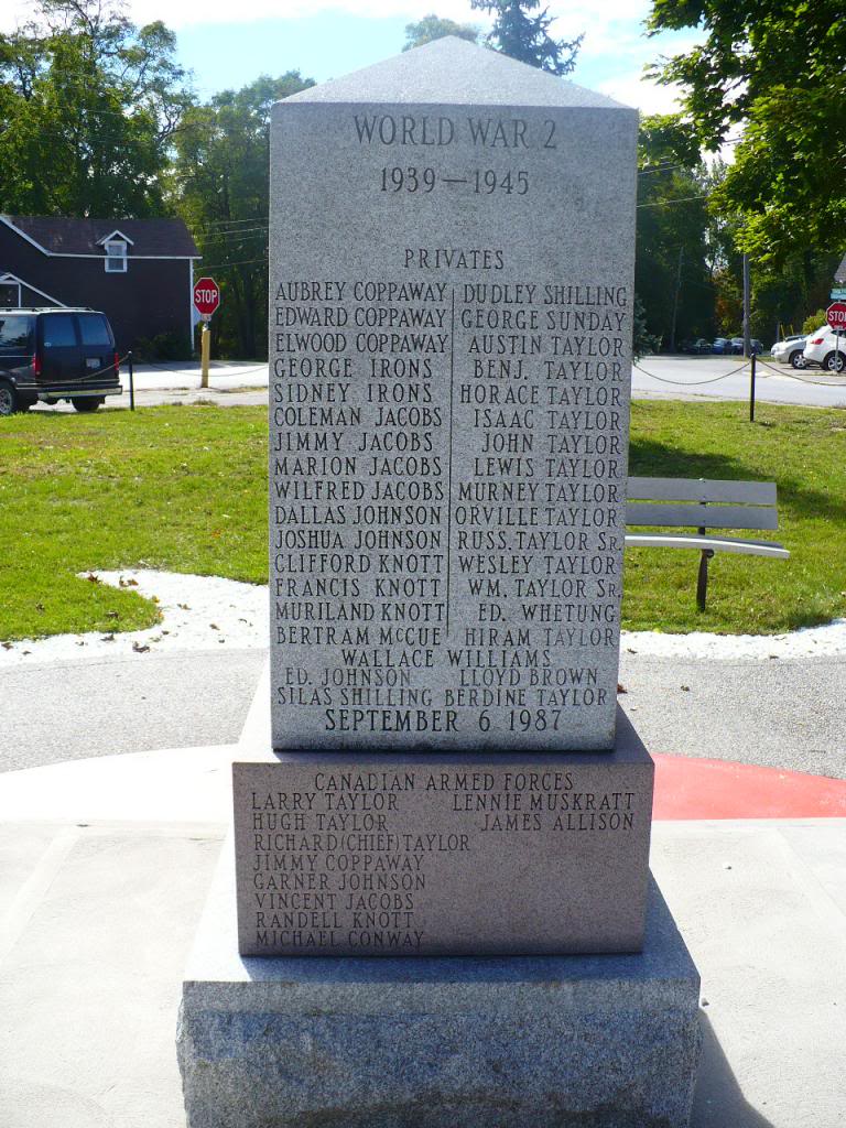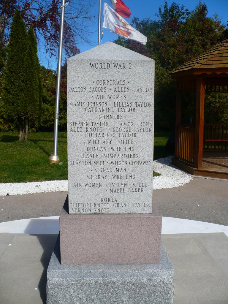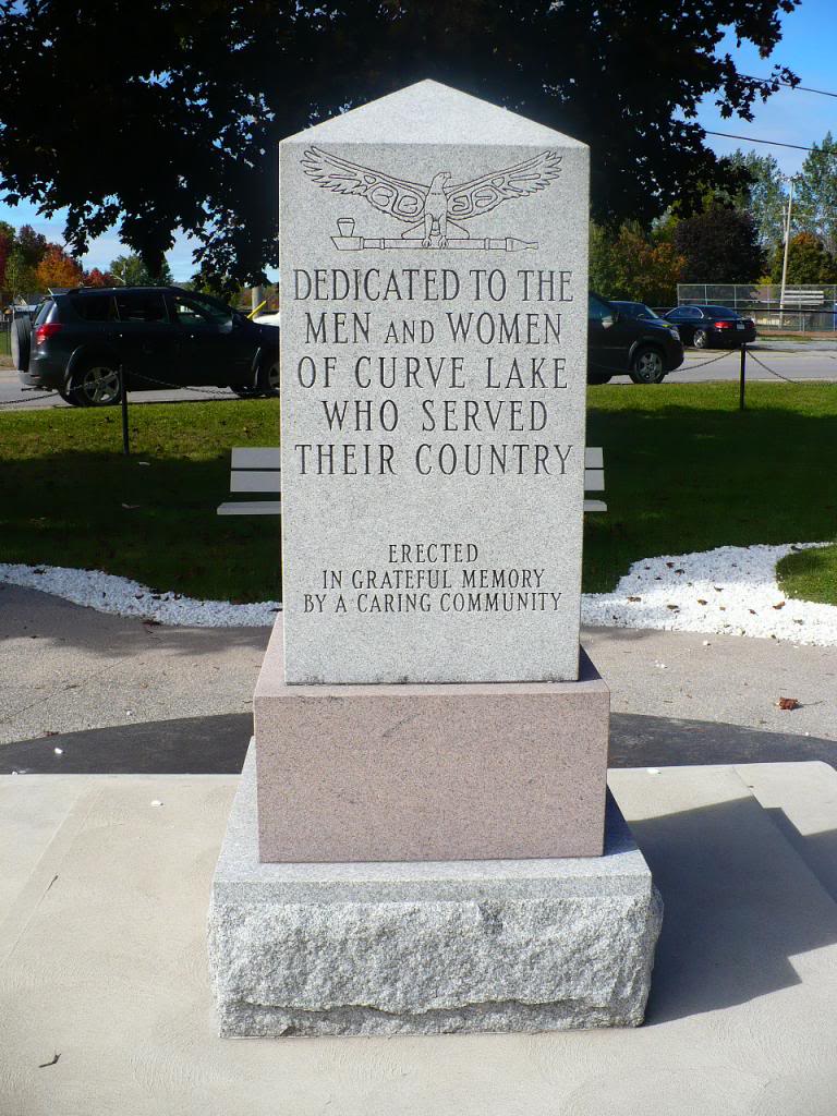 This cenotaph, a tribute to the members of the Curve Lake First Nation Band, who served in the major conflicts of the 1900's. It stands proudly in a small, well-kept park near the village centre. The ground surrounding the memorial is in the form of a medicine wheel, which gives great strength to the names engraved on this marker. Originally erected in 1987, it was updated and re-dedicated in 2011.