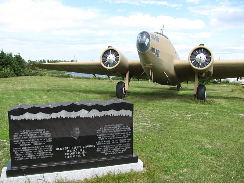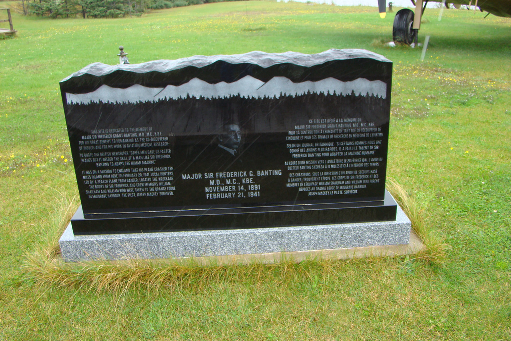This Memorial was unveiled on August 16th, 1991, in memory of Dr. Sir Frederick Banting (discoverer of insulin), F/O William Bird, co-pilot, and R/O William Snailham, Radio. This Memorial is 2 feet by 2 feet by 2 feet, and 3 inches thick. It is made of marble stone that was constructed by Muir's Stone Cutters in St. John's. Muir's Stone Cutters also donated the plaque.