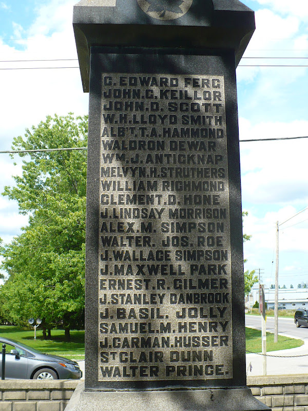 This monument is dedicated to the men of the former Elma Township, who gave their lives in the two World Wars. The memorial consists of a black granite base with the names and dedications, topped by the white marble statue of a World War I soldier.