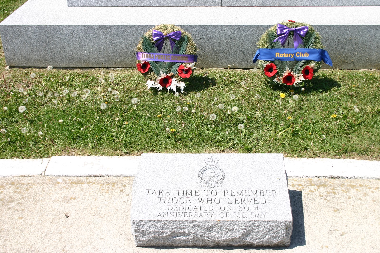 Bordering the cenotaph is an outline of a maple leaf. The Second World War and Korean War inscriptions were added later.