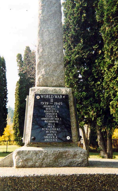 The Cenotaph Committee was established in 1936 “to erect a public memorial to the men of Enderby City and District who gave up their lives in the World Wars”. The monument was built for $235 by Vernon Granite and Marble Co. in Okanagan Landing. Subscriptions totalling $242.15 were given by local residents and organizations. The Cenotaph was built in 1937 and it was erected on the southwest corner of the lawn in front of City Hall, but subsequently moved to Cenotaph Park in 1970. This property was purchased by the local Centennial Committee. This memorial is dedicated to the citizens of Enderby who gave their lives in the First and Second World Wars, the Korean War and the Merchant Navy. There are six plaques on this memorial, three on the south side and one on each of the other three sides. Directions – From downtown Enderby heading north from the main intersection (George Street and Cliff Avenue), take the first road to the right (Mill Avenue). About a block down this road the memorial is located on the left side of the road.
