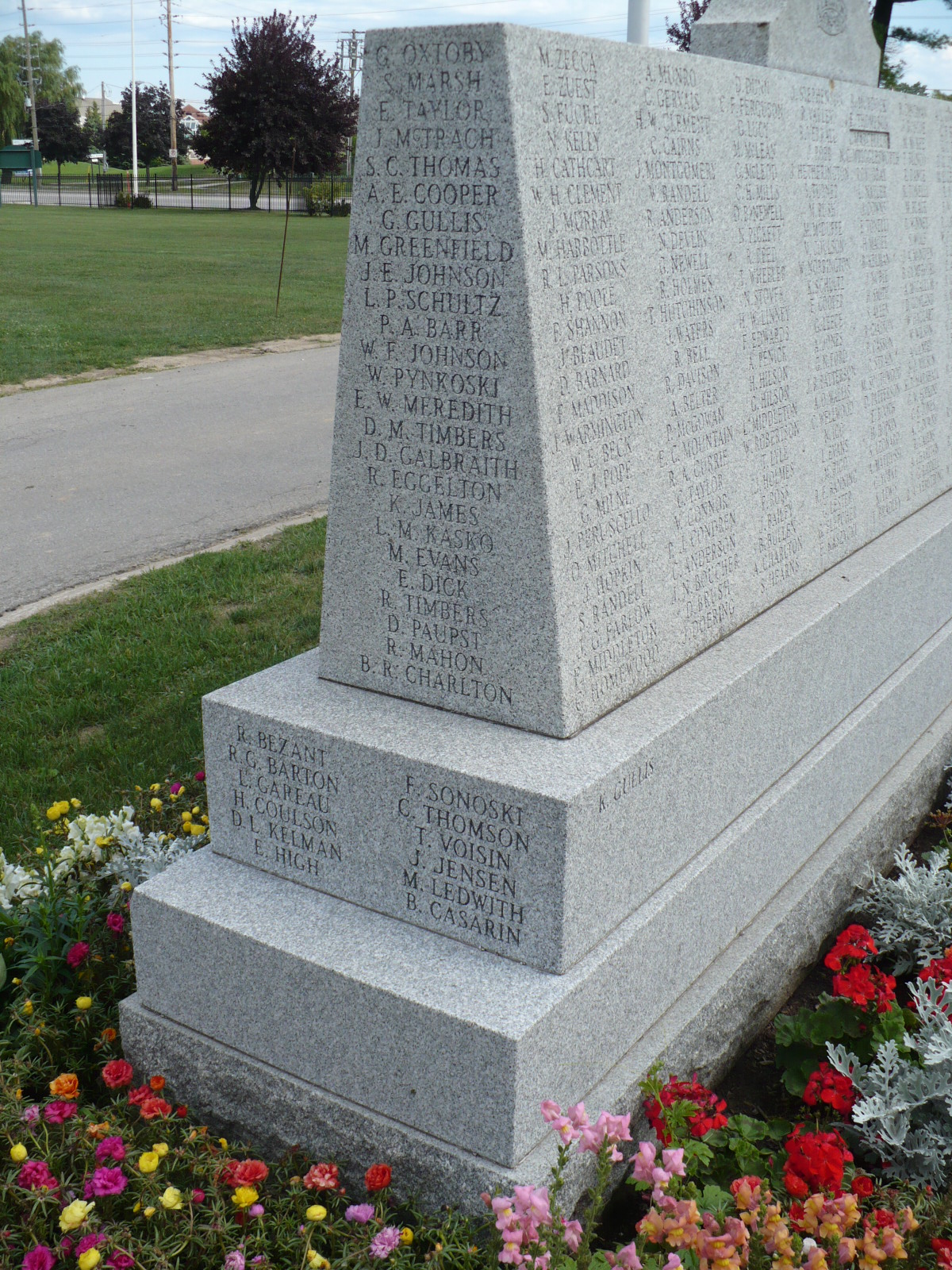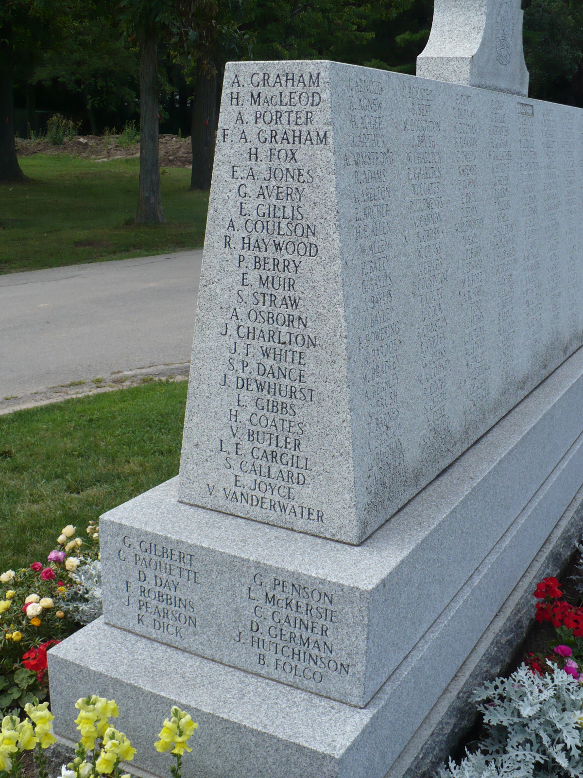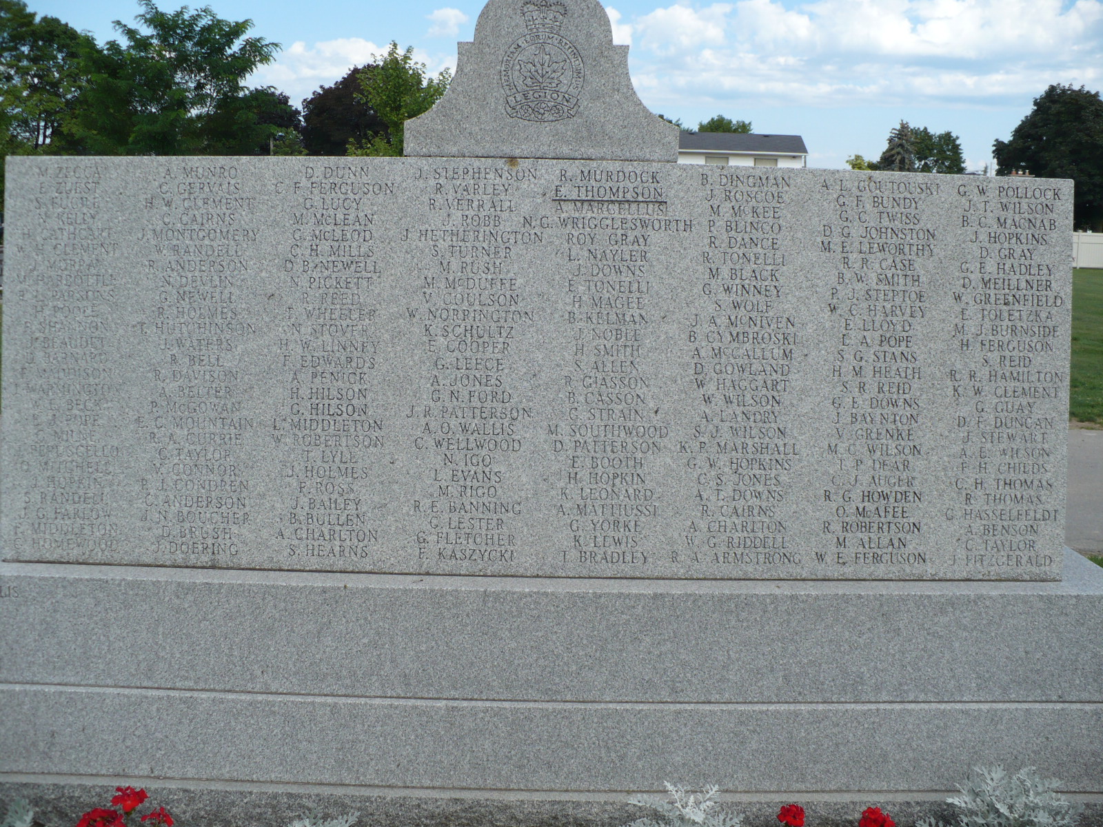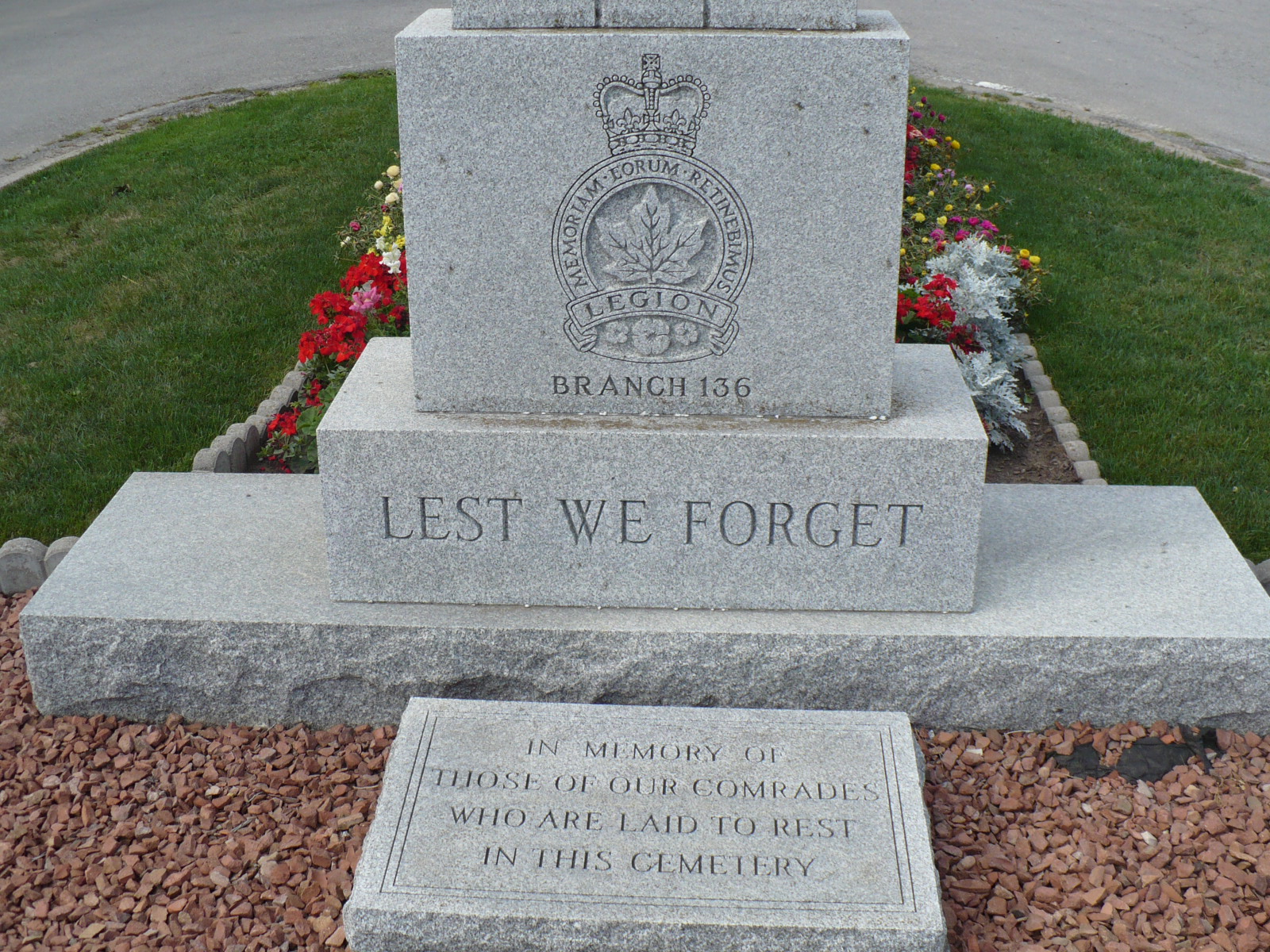 Erected by the Royal Canadian Legion Branch 136 on lands provided by the Evergreen Cemetery Board, this memorial is dedicated to those who died in the First and Second World Wars and the Korean War.