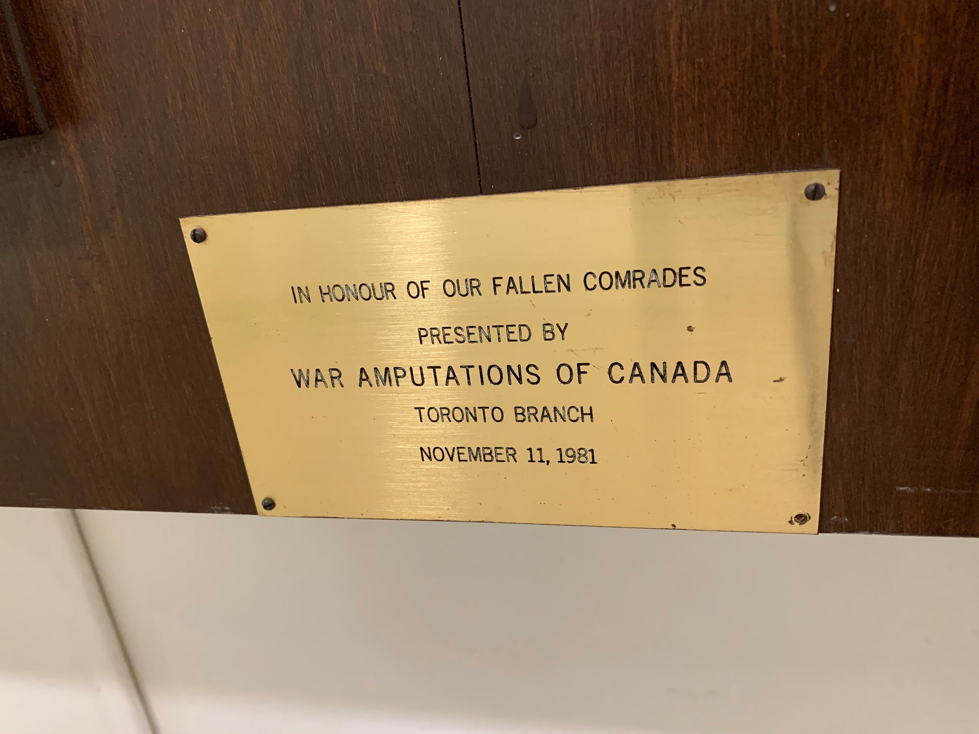 The Fallen Comrades Window was erected in the Veterans Chapel at Sunnybrook on November 11, 1981. It honours the War Amputations of Canada's fallen comrades from the First and Second World Wars and was created in 1950 by First World War Veteran Robert J. (Bob) Edwards who had taken up this type of work in 1919. The window was previously located in the chapel of the War Amps Memorial Centre, Toronto branch building at 62 Wellesley Street.