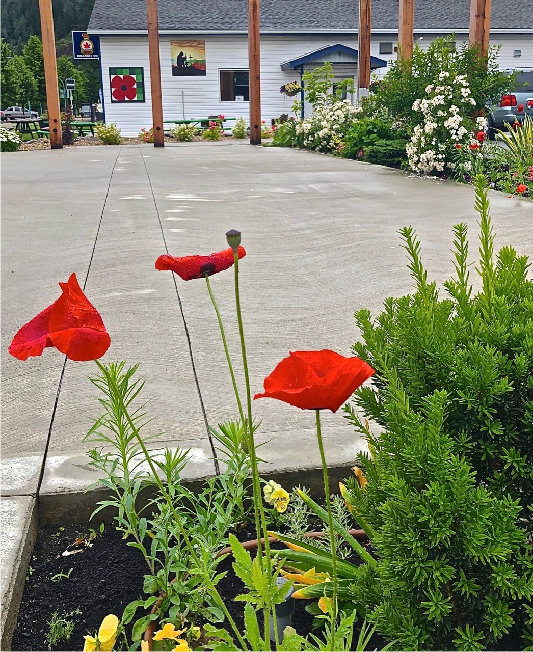 This memorial, a painting of a soldier kneeling before a fallen soldier's grave, was sponsored and spearheaded by Communities in Bloom in partnership with the Eagle Valley Arts Council, the Royal Canadian Legion Branch 99, the District of Sicamous, and local businesses. It was painted in a barn quilt style by Dianna Stooshnov in 2019. Next to it hangs the Poppy Painting.