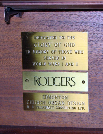 This organ was dedicated in memory of those who served in the First and Second World Wars. There is a plaque located on the organ. It came with the organ which was purchased about Jan. 1988.
