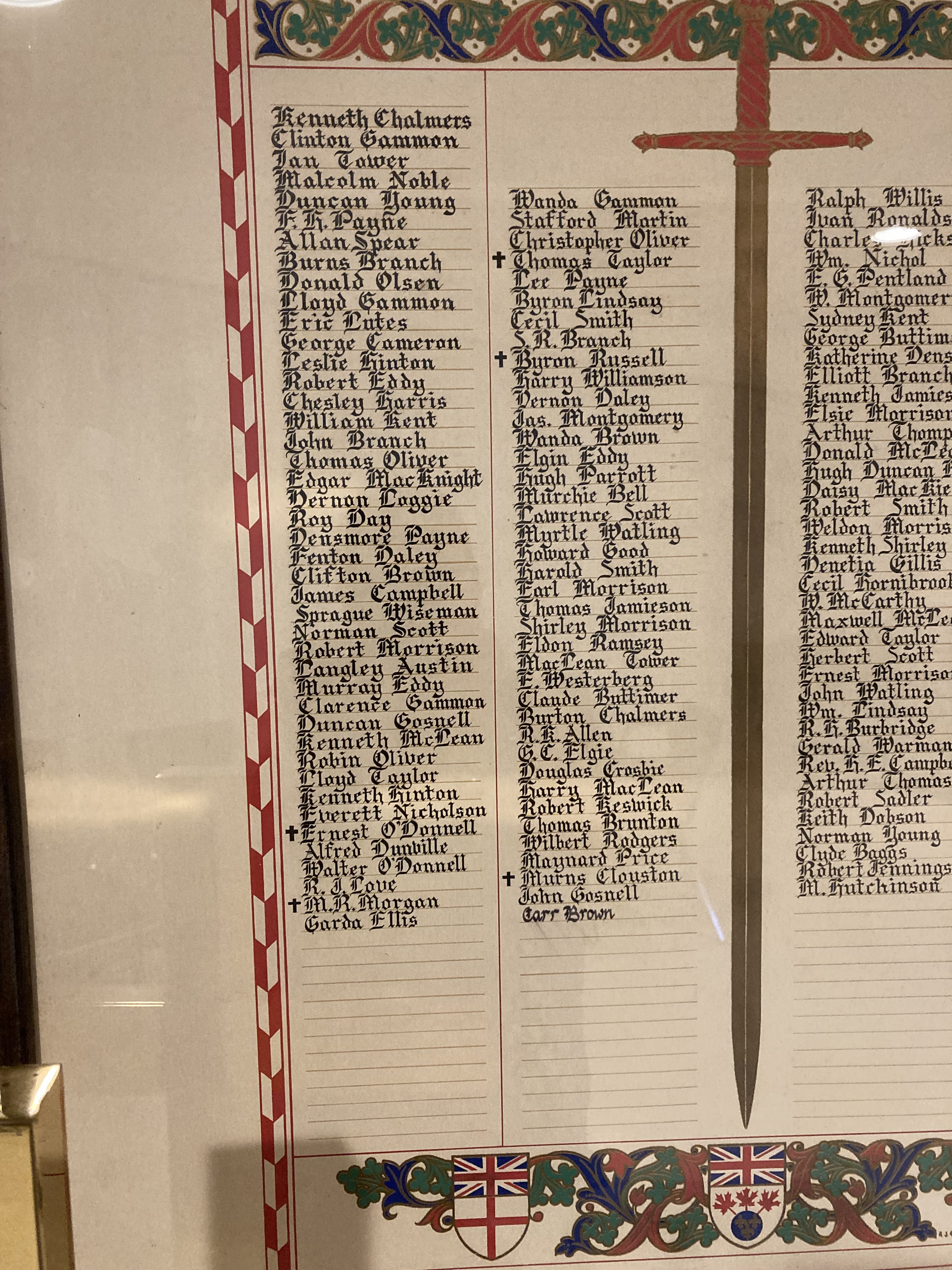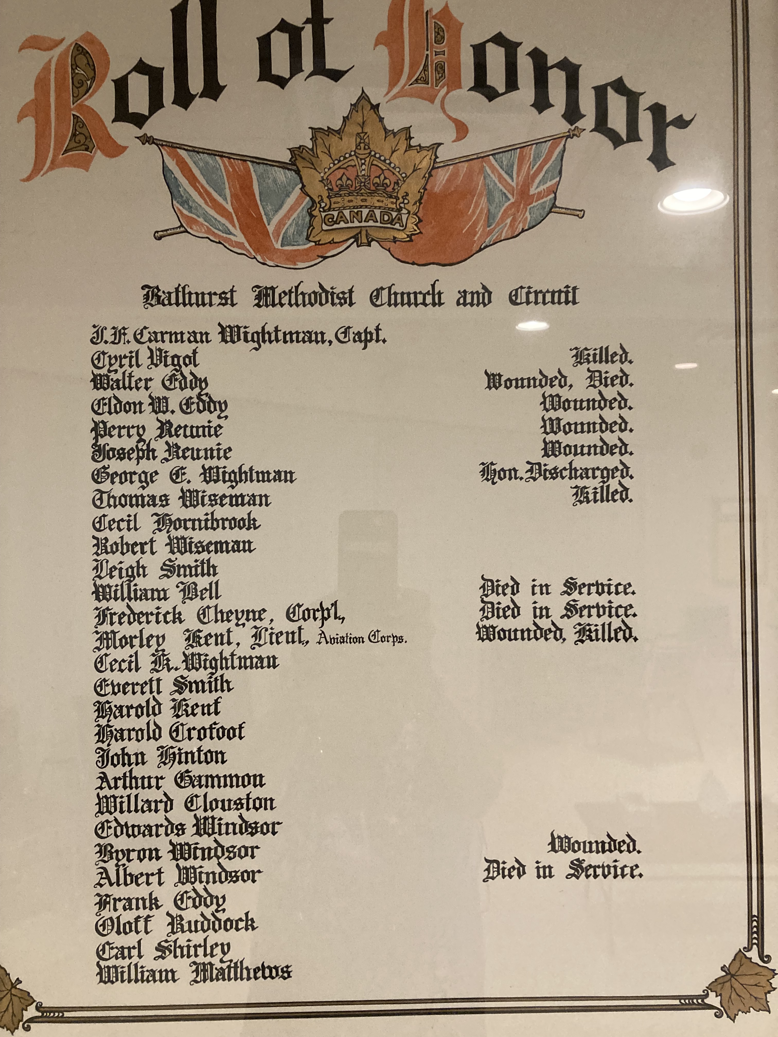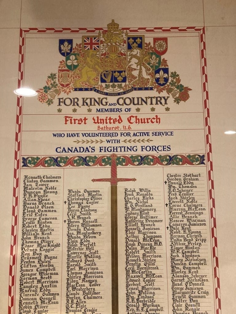 These memorials list local citizens from the First United Church and the Bathurst Methodist Church who served with the Canadian military during wartime.
