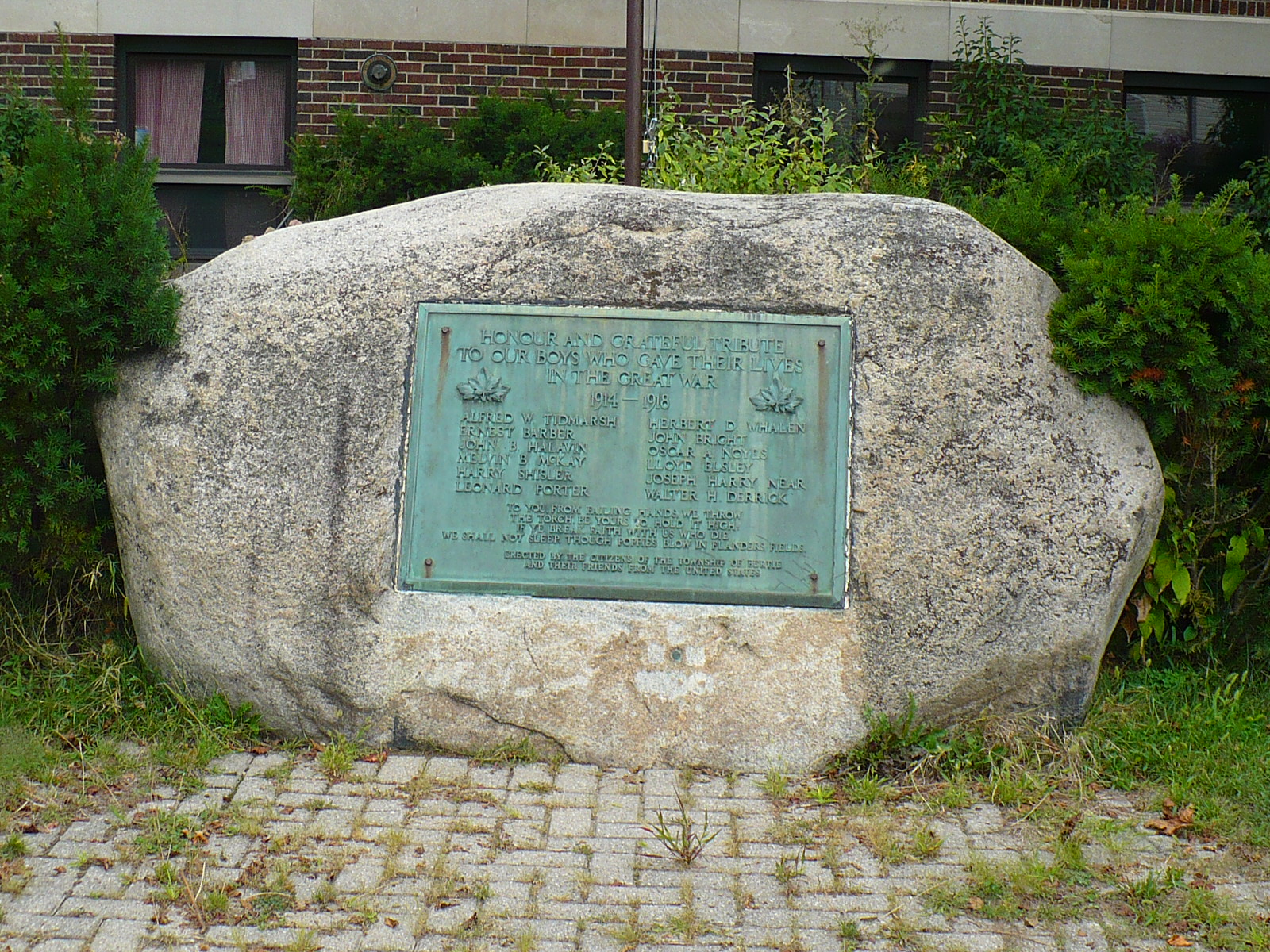 This memorial, located on the grounds of Ridgeway Public School, is a stone slab with a bronze plaque and is dedicated in honour of the boys who gave their lives in the First World War. It was unveiled in 1921 by the citizens of the Township of Bertie and their friends from the United States.