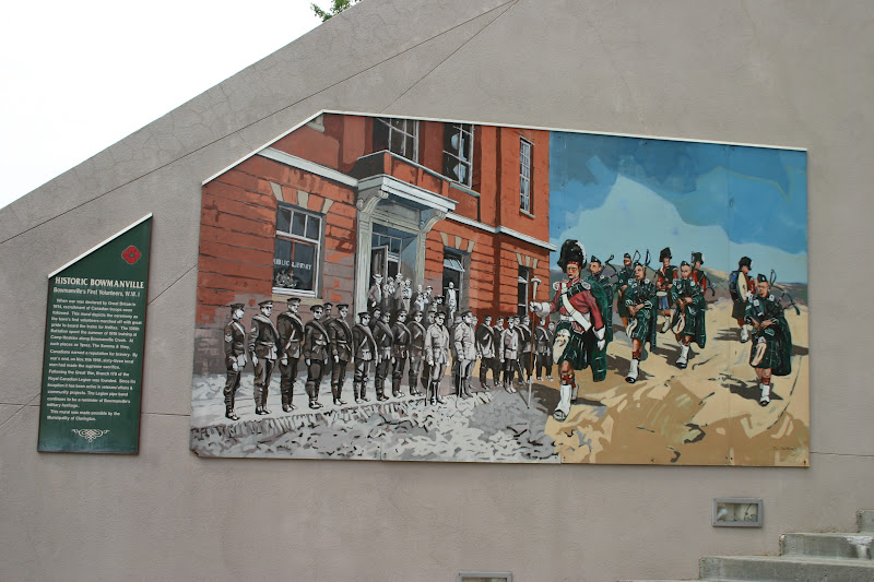 The First World War Mural was erected by the Municipality of Clarington. When war was declared by Great Britain in 1914, recruitment of Canadian troops soon followed. This mural depicts the ceremony as the town's first volunteers marched off with great pride to board the trains for Halifax. The 136th Battalion spent the summer of 1916 training at Camp Hoskins along Bowmanville Creek. At such places as Ypres, The Somme and Vimy, Canadians earned a reputation for bravery. By war's end, on November 11, 1918, 63 local men had made the supreme sacrifice.