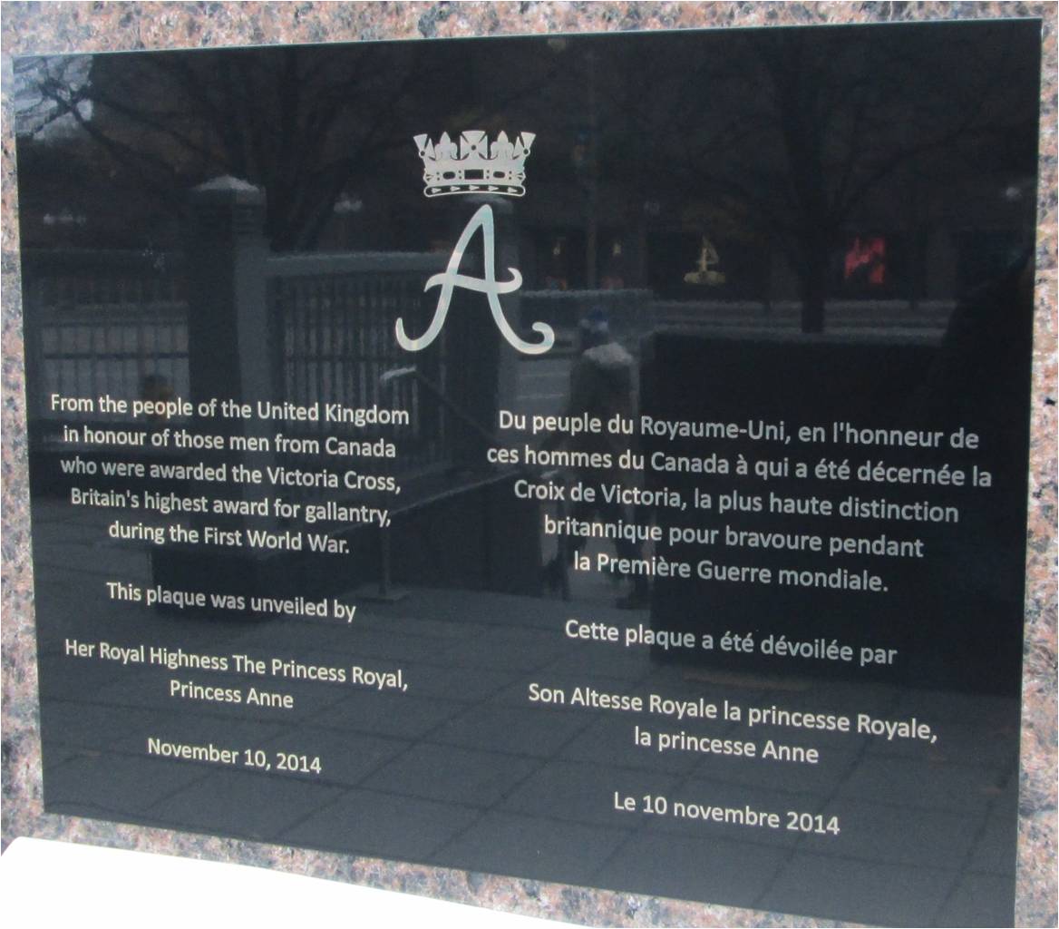 This bronze plaque is dedicated to the Canadians who were awarded the Victoria Cross during the First World War. It was unveiled on November 10, 2014 by the British High Commission.