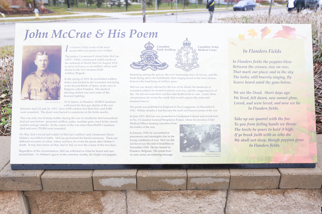 On November 1, 2015, the park was officially dedicated to commemorate the 100th anniversary of the famous war poem, In Flanders Fields. The park features unique walkways and walls made of brick which mimic the trenches in the First World War, poppy beds, a bronze plaque with the poem in the author’s original handwriting, a storyboard with the story of McCrae and how he came to write the poem and another storyboard with the story of how the poem itself became tied to remembrance and the poppy became the symbol of remembrance.