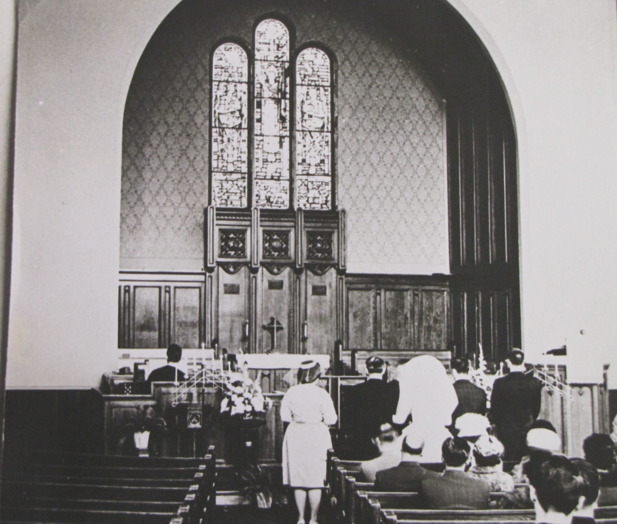 The center window was donated by the congregation in memory of the nine men from the church who died while serving in the Second World War. The right window was donated in memory of Oiler Ross Edward Stevens.