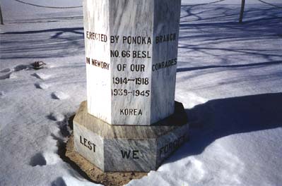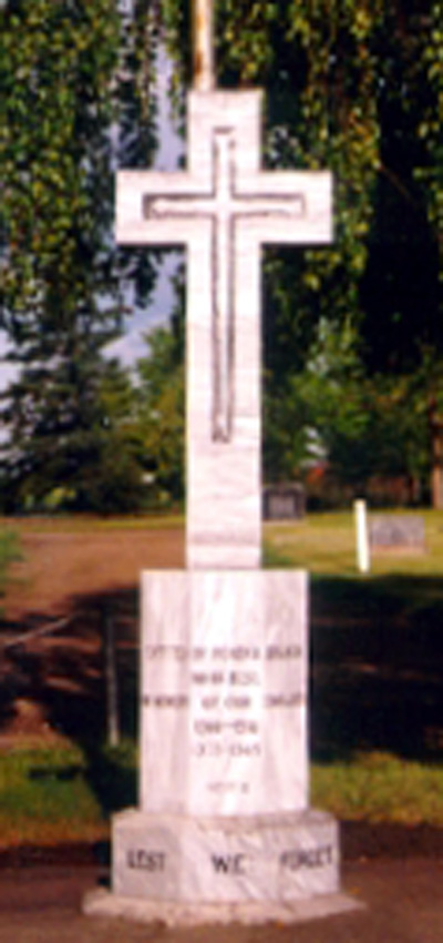 This memorial is dedicated to the memory of the local men and women who served in the First and Second World Wars and the Korean War. It was erected by the Ponoka Branch of the British Empire Service League (now the Royal Canadian Legion). The cross was unveiled by colonel Palmer, Agent for Indian Affairs, Hobbema, early in the 1930s. The late Comrade Frank Mayled, Head Gardener at the P.M.H. landscaped the plot with a rare variety of trees and shrubs. After Frank died in 1943 the shrubs and trees were replaced with mulch easier to manage lawn and flowers. The chain and post guard surrounding the Cross was placed there by an anonymous friend.