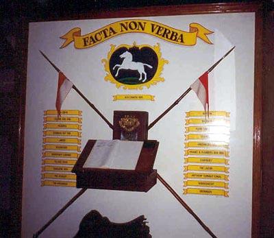 This monument, constructed by the members of the Senior Non-Commissioned Officers' Mess, is centred on two lances presented to the regiment by Warrant Officer R. Davies, a former Squadron Sergeant-Major with the Fort Garry Horse. The wall hanging incorporates the regimental motto and the battle honours won during the North West Rebellion and the First and Second World Wars. The plaque bears a large metal copy of the regimental cap badge.