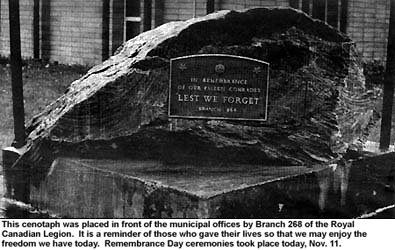 In the summer of 1973, five Legion members and friends made a trip of approximately 200 miles to get a cenotaph. With a donated truck, D4 cat and time, a 400-ton jade rock was loaded and brought to Fort St. James. The jade was placed in front of the Village Office and forms for cement placed. After the cement set, a diamond-faced circular saw was used to face the front. A lot of these bits were given to Legion members (and some stolen.) A bronze plaque is on front. Three flag poles are set in the cement behind the cenotaph. Flags are raised for November 11 and various other times of the year. The Cenotaph was dedicated April 21, 1979, by the Legion Padre. It was also the 15th anniversary, so all past and present Zone Commanders were present for the parade and dedication. In the summer, the cenotaph is surrounded by lawn and flowers.