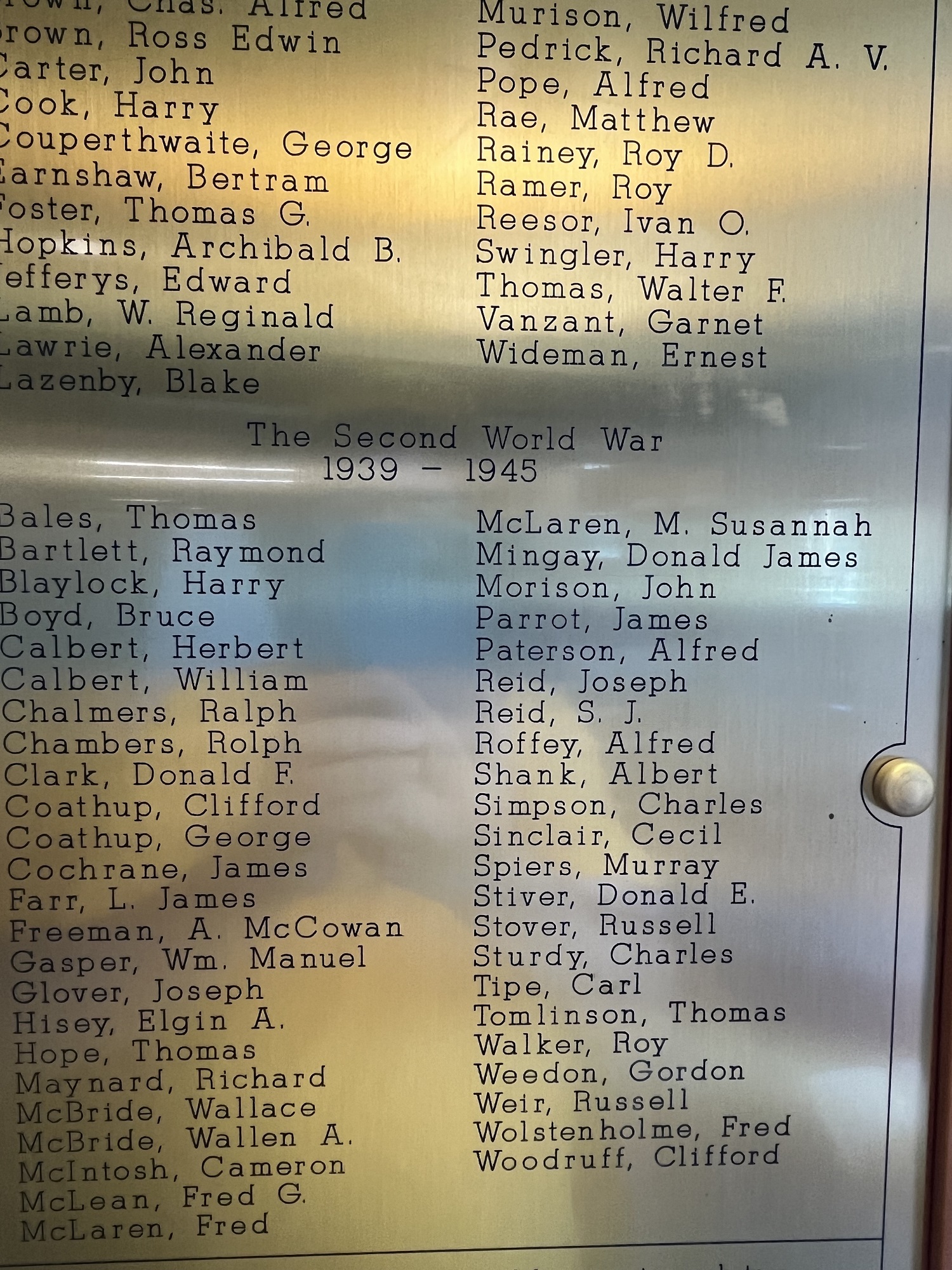 The pool and setting which compliment the cenotaph and indeed are part of it, have been constructed by contractors who have contributed labour and material, either without or at reduced cost. The remainder of cost was hoped to come from the municipality. This cenotaph commemorates those who are buried elsewhere, who have died at war for this, our Canada, in the defence of those privileges and those freedoms exercised in their fullness in the dedication of this sculpture, November 11, 1967.