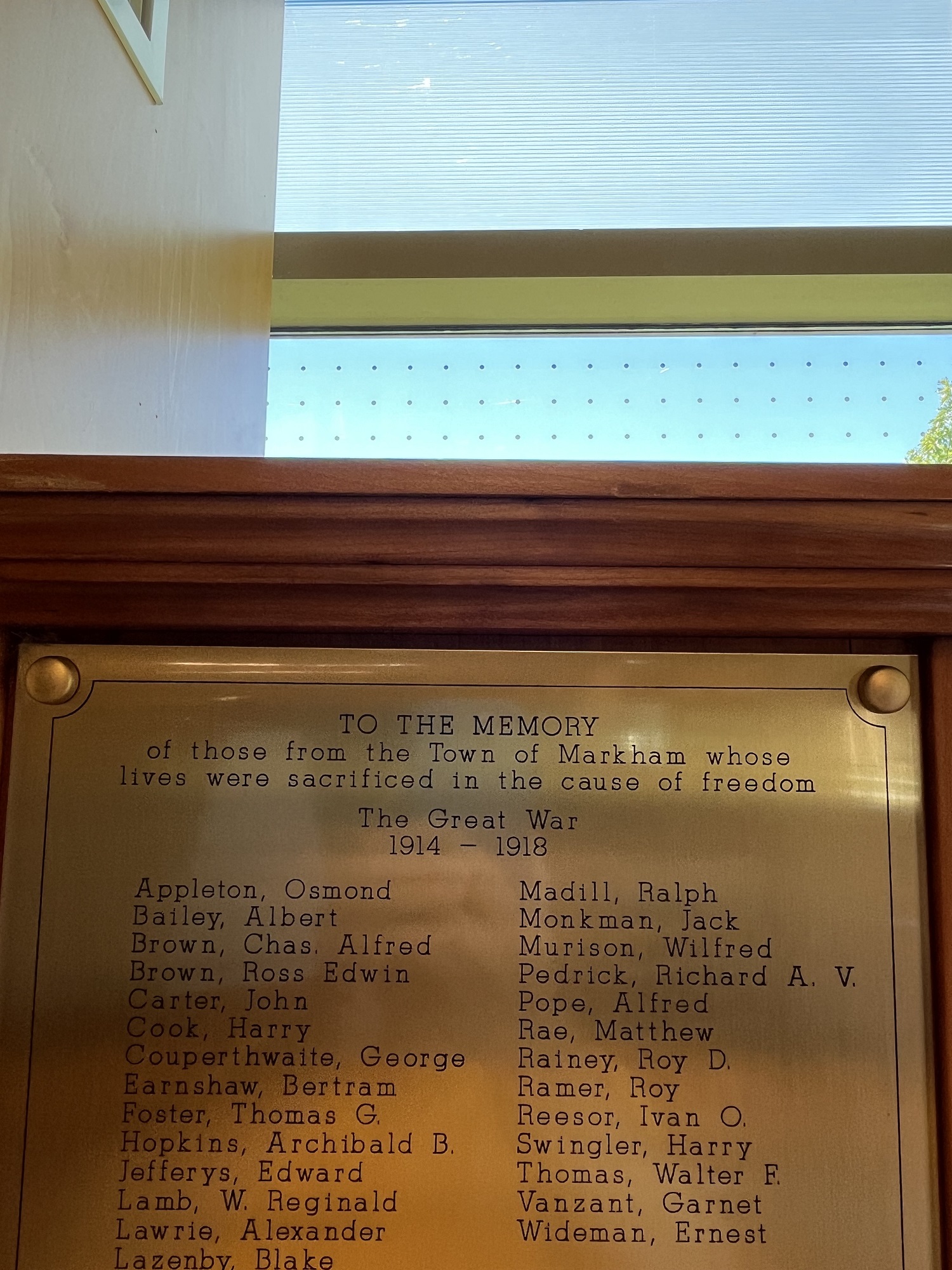 The Cenotaph Committee: Chairman Mr. Paul W.J.Mingay, Mrs. Fred (Edna) Reid, Mr. Anothony C. Allen, Mr. Allan T. Paterson, Mr. Lloyd Abernathy; Councillor Village Representative Reeve Alma Walker; Markham District Veterans Representatives President Arthur Underwood 1964-65, President Willian Birch 1965-66, President Charles Mullett 1966-67, First Vice-President Jack Peplow 1967.