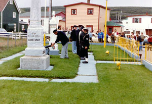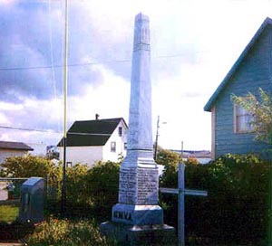 Erected by the Great War Veterans' Association - the predecessor of the Royal Canadian Legion -, this memorial is dedicated to the local war dead of the First World War. This simple, yet noble, memorial takes the shape of a straight shaft of blue-grained marble, which is set in a rough granite base. The badge of the Royal Newfoundland Regiment, enclosed by Laurel wreath, is carved on the North side of shaft, while underneath is a list of engagements in which the Regiment fought. On the west side of the shaft is carved the following verses: "In Flanders Fields the poppies blow..." while on the east side is carved crossed rifles and an Ensign enclosed in a wreath of laurels, underneath which is a list of causalities, engagements, and dates. The memorial, which stands about 16 feet high, was erected by the well-known firm of J.D. Steel Monumental Works, North Sydney, Canada, and erected by the citizens of Fortune under the auspices of the Fortune Branch, G.W.V.A., in memory of their fallen heroes and comrades. The Fortune War Memorial was unveiled with deep solemnity on September 27 by Dr. MacDonald, J.P., in the presence of 800 people from Fortune and Grand Bank. A message from His Excellency the Governor was read by Capt. G.J. Whitty, M.C., expressing regret at his unavoidable absence. Addresses were also made by Rev. Mr. Howse, Dr. MacDonald, Ensign Carnick, T.E. Spencer and J.R. Dixon, secretary of the Fortune Branch. The Rev. Young pronounced the dedication prayer and the ceremony proceeded amidst great solemnity. The floral tributes were many. The firing party, under Lieut. W.C. Hawker, manager of the Bank of Nova Scotia, assisted by Bugler Cook, performed their duties with military precision. The memorial is a splendid tribute from the people of Fortune to the memory of her gallant lads who made the supreme sacrifice. The G.W.V.A. and people of Fortune are worthy of all praise in subscribing the entire cost of this memorial and thus perpetuating the memory of their fallen townsmen by handing down to posterity a monument that will stimulate, elevate and inspire youth for many generations to come as they recall the magnitude of the deeds performed and the sacrifice of Fortune's honoured dead.