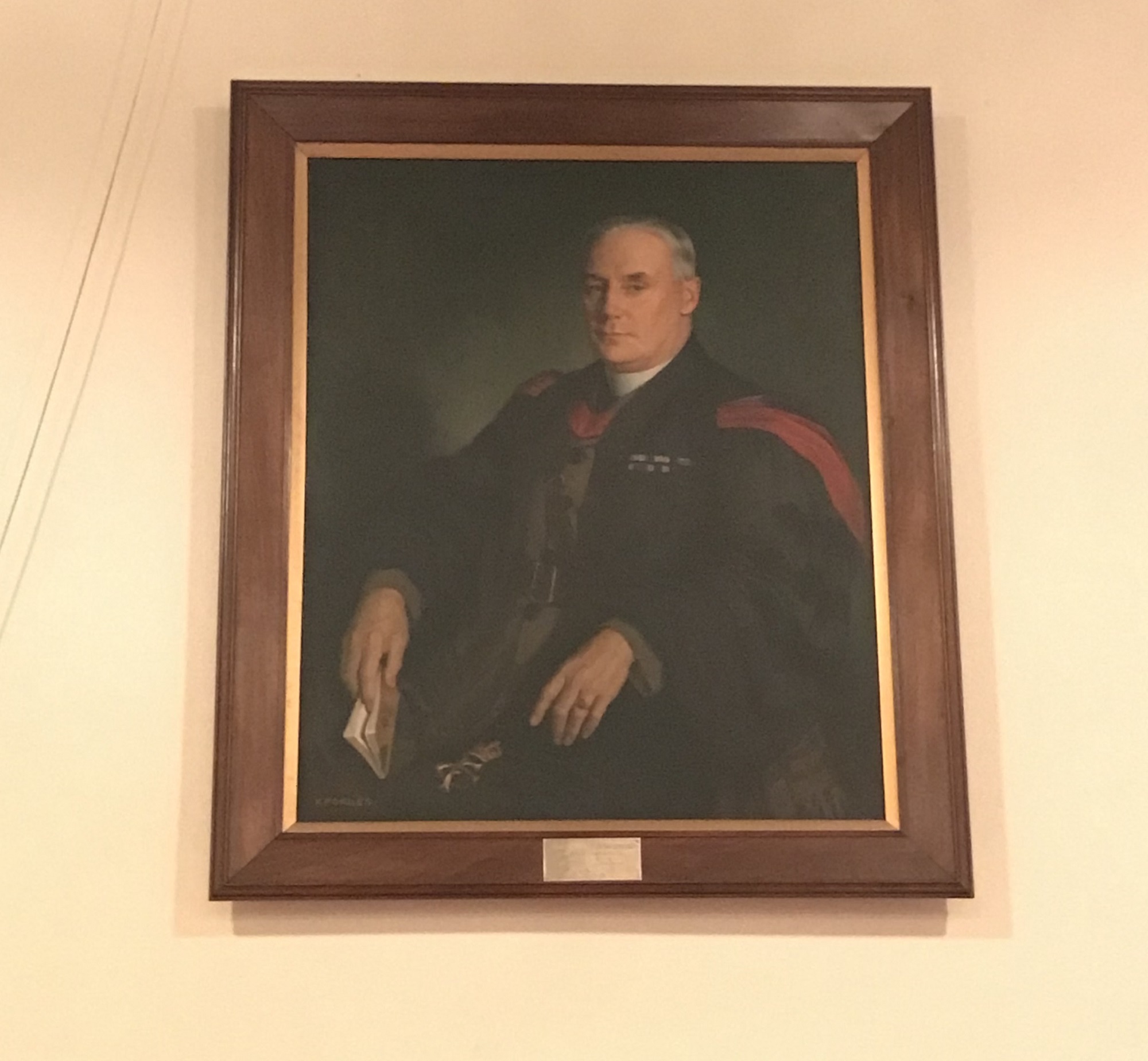 Founder's Portrait is located in the East Transept of Canadian Memorial Chapel, between the Ontario and Quebec windows. The portrait of the Reverend Lieutenant-Colonel (Lt.-Col.) G.O. Fallis, CBE, ED, BD, DD, the founder of Canadian Memorial Church. The portrait by Kenneth Forbes, R.C.A., was unveiled by Lt.-Col. Fallis' daughter, Mary M. Fallis, on November 16, 1942. Captain Howard Green, MP, gave the address and a congregational reception was held afterwards.