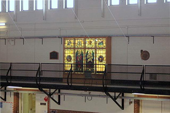 The Air Service/Armoury personnel erected this Stained glass memorial window. This World War Two Memorial is called: The Four Freedoms. 1943. President Franklin D. Roosevelt's speech about the Four Freedoms became a famous rallying point during the dark days of World War Two. The memorial is a group of eight individual stained glass windows relocated by The Women's Auxiliary to the armoury when the church closed.