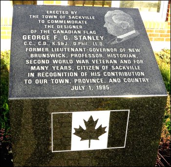 The George F.G. Stanley Memorial was erected by the Town of Sackville and unveiled on Canada Day, 1 July, 1995. The memorial honours his many contributions to the Town of Sackville, the Province of New Brunswick and to Canada. George suggested the design for the Canadian Flag, which was officially inaugurated on February 15, 1965. The date now celebrated annually as National Flag of Canada Day.