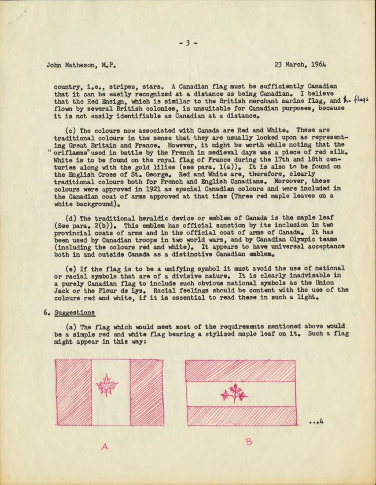 Part of Stanley's March 23, 1964, letter to MP John Matheson, showing Canadian flag concept. The letter pre-dates the official announcement of a search for a new flag by almost two months.