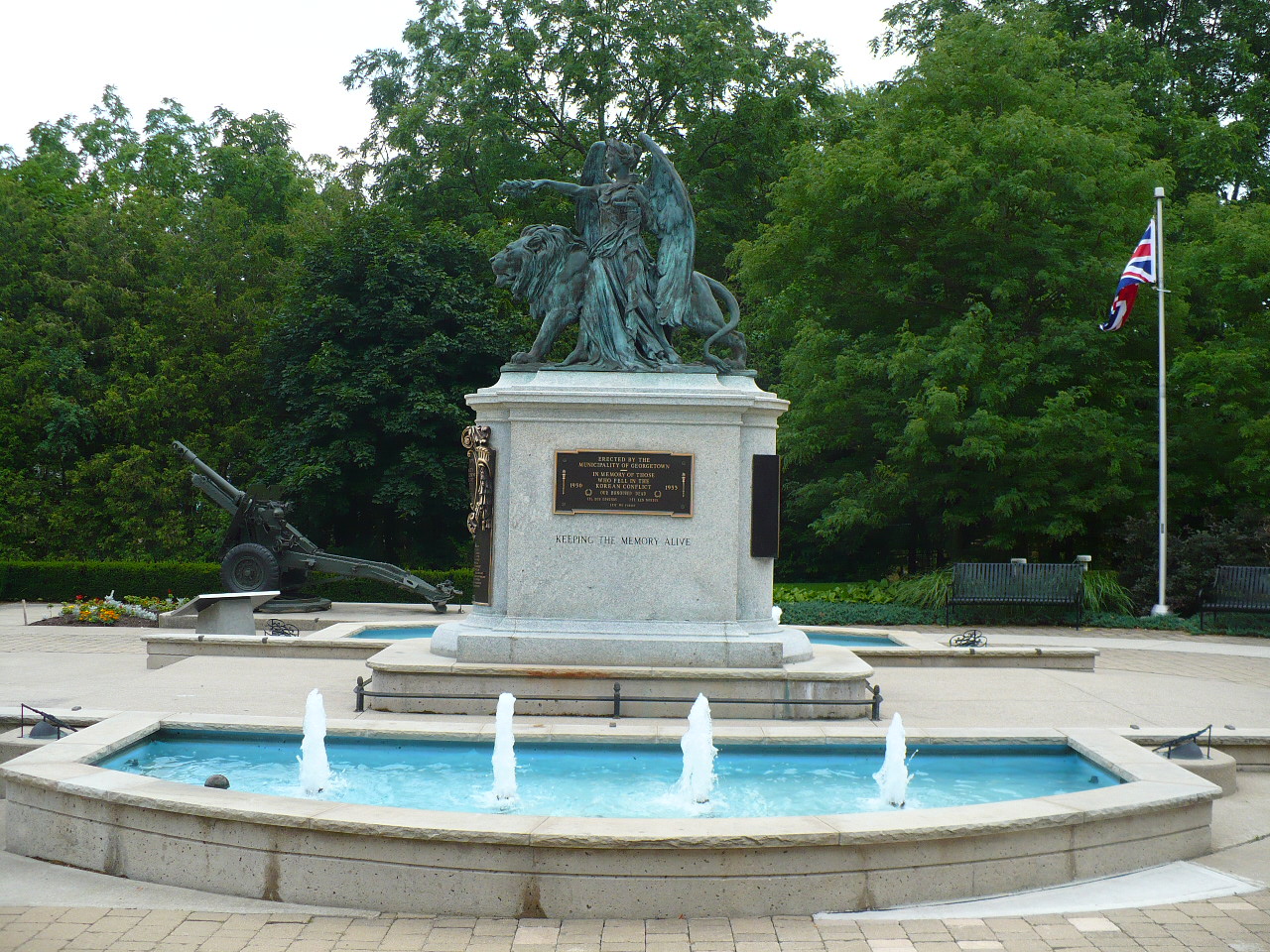In April 1924, Council voted to place the war memorial at the junction of Guelph Street and Main Street North with site preparations beginning in late May. On top of the memorial is a large statue of the Imperial Lion of Britain and winged Britannia Victoria. the Imperial Lion of Britain, commonly seen on Canadian, British, and Australian war memorials, embodies Britain’s strength, power, and guardianship as the head of the Empire. This symbol serves a dual purpose: it represents unity among the dominions and colonies that transcended individual national identities to form a cohesive British imperial identity. For Canadian memorials, the lion not only signifies the country’s ties to Britain but also honors the shared sacrifices made by Canadians and their fellow soldiers within the Empire during conflicts fought under the imperial banner. It is important to note that Canadians during this period identified as British North Americans, rather than as North Americans under British rule.