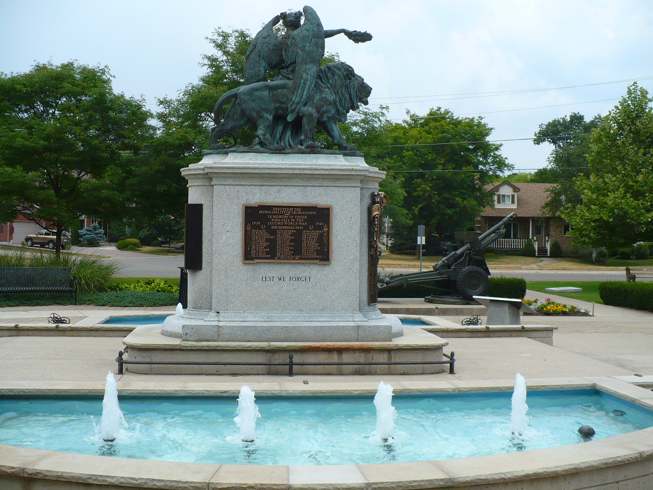 After the Second World War, the monument gained renewed importance as the town faced the loss of another generation of young men in Europe. On September 26, 1948, Mayor Joseph Gibbons led a Legion parade, accompanied by the Lorne Scots Band and Georgetown Girls Pipe Band, to unveil a new tablet listing the names of Georgetown residents who had fallen in the Second World War.