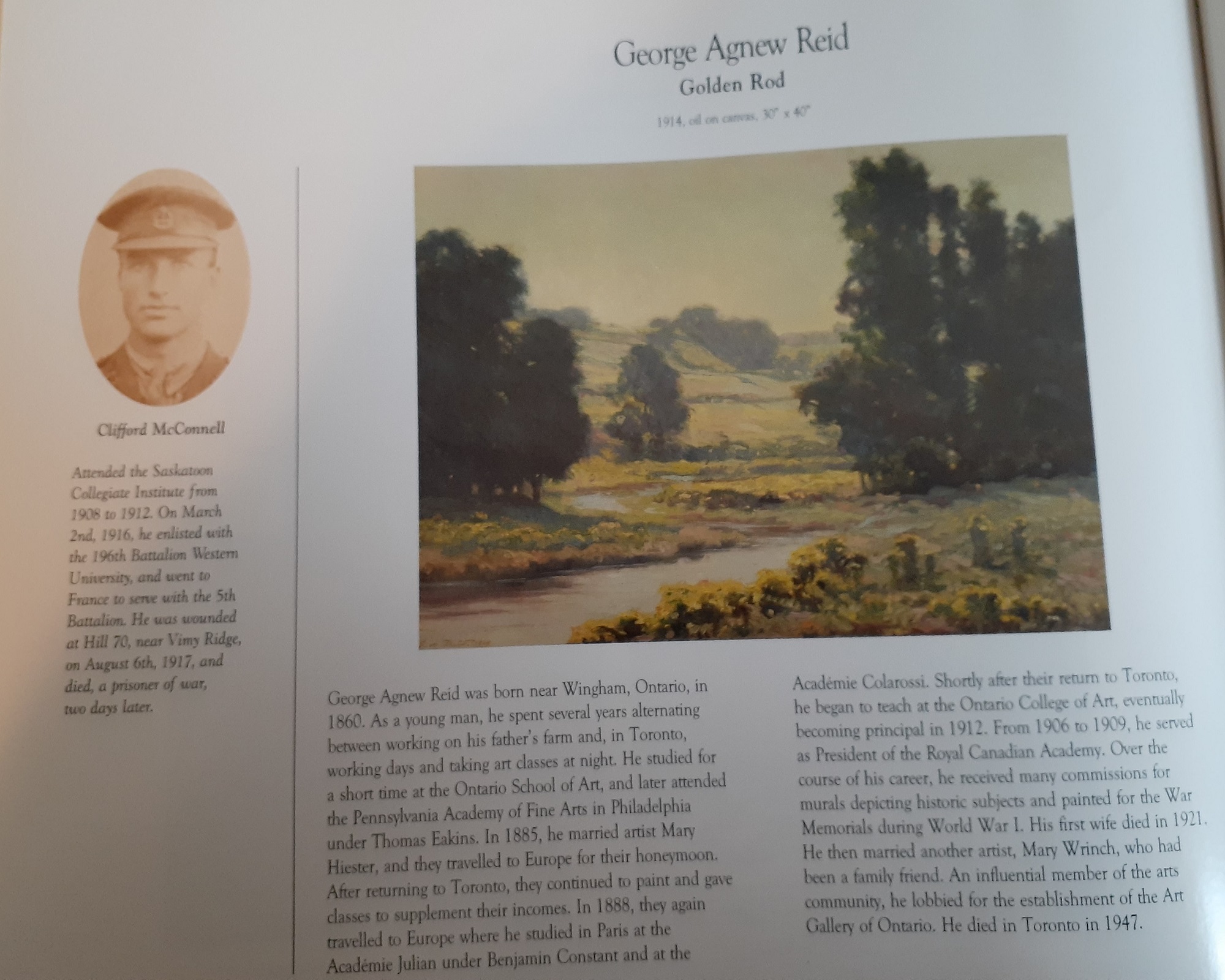 George Agnew Reid's Golden Rod was acquired between 1921 - 1924 and dedicated to Lieutenant Clifford McConnell. Clifford attended Saskatoon Collegiate Institute from 1908 to 1912. He enlisted on 2 March 1916 and was wounded at Hill 70 near Vimy Ridge on 6 August 1917 and died as a prisoner of war, two days later.