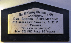 Erected by his parents, this memorial is in memory of Dvr. Gordon Shelmerdine, killed in action during the First World War.