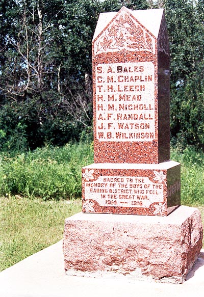 This memorial has been moved from Baring, Sk to Grenfell, SK and now stands beside the Grenfell cenotaph.