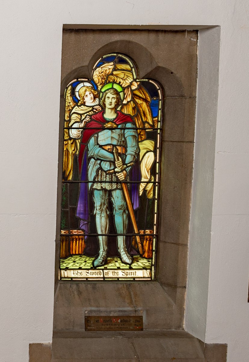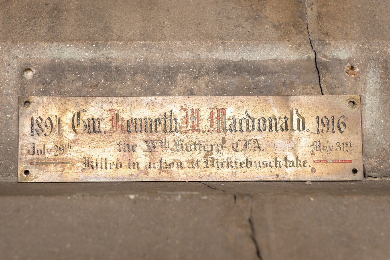 A window in memory of Gunner Kenneth McLeod MacDonald was unveiled in December 1920. Gunner MacDonald was a member of the 15th Battery of the Canadian Field Artillery who died on May 31, 1916.