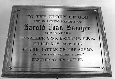 Erected by the deceased soldier's mother, this memorial is dedicated to Signaller Harold Juan Sawyer, 32nd Battery, Canadian Field Artillery, who was killed during the Battle of the Somme on 23 November 1916.