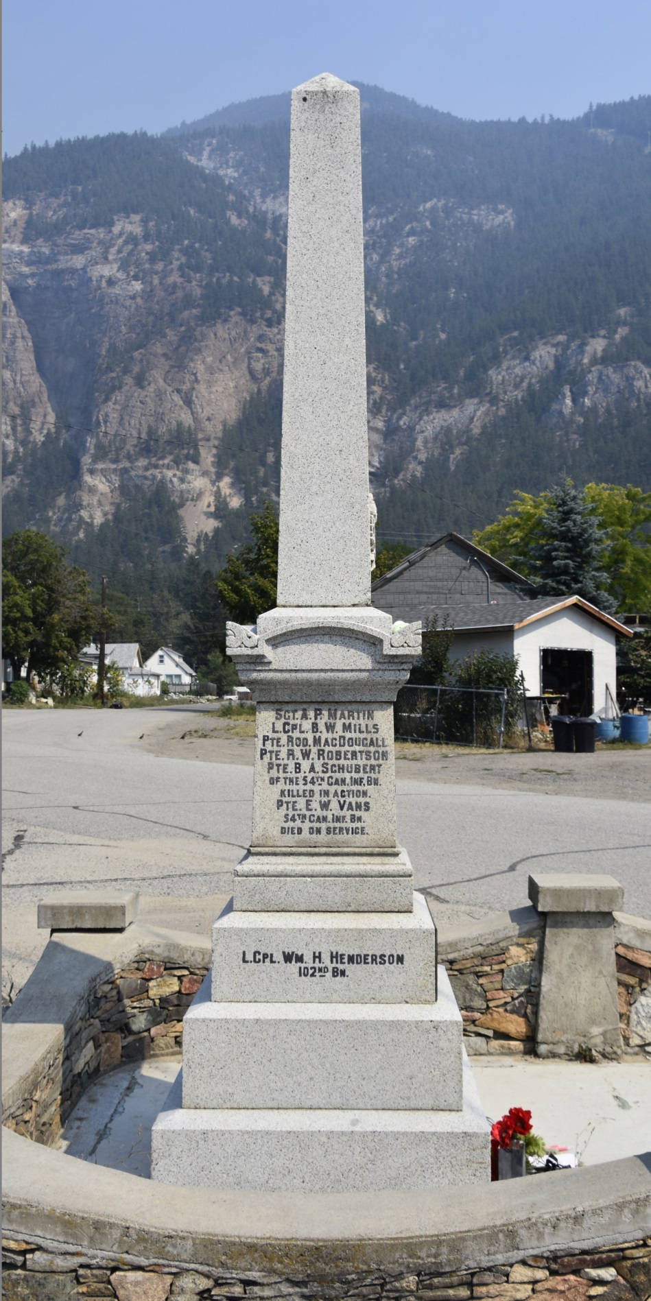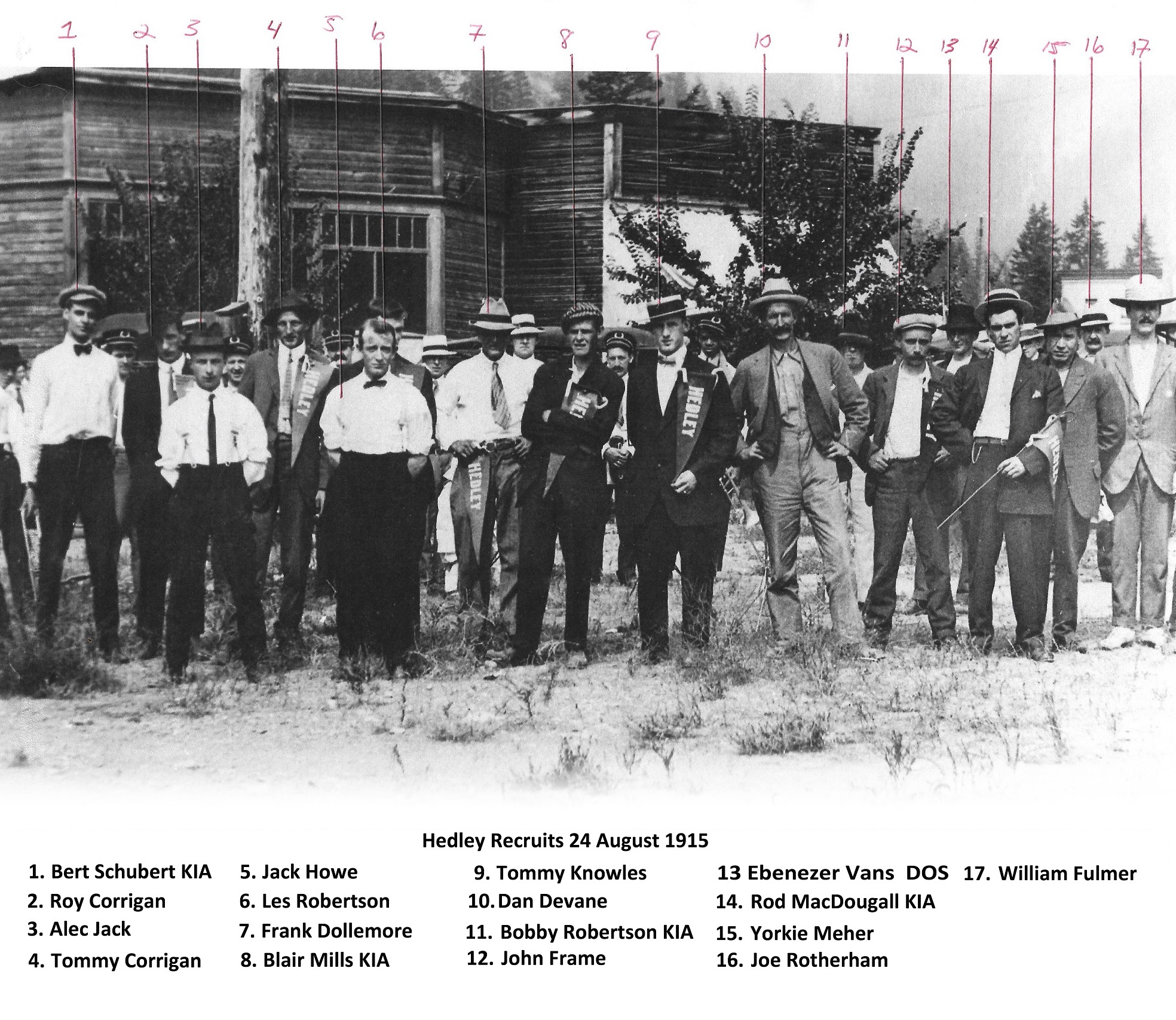 Six of the men on the cenotaph are from the 54th Kootenay Battalion and of those, five were from the original group of 17 who signed up together. When these 17 men left Hedley on August 24, 1915, they gathered at the exact location of the future cenotaph and had a group photo taken. There was a big send-off. All the townspeople gathered, the children were let out of school and the town brass band played. The recruits left Hedley in a caravan of vehicles draped with banners which read, "Recruits from Hedley, the Machine Gun Town."