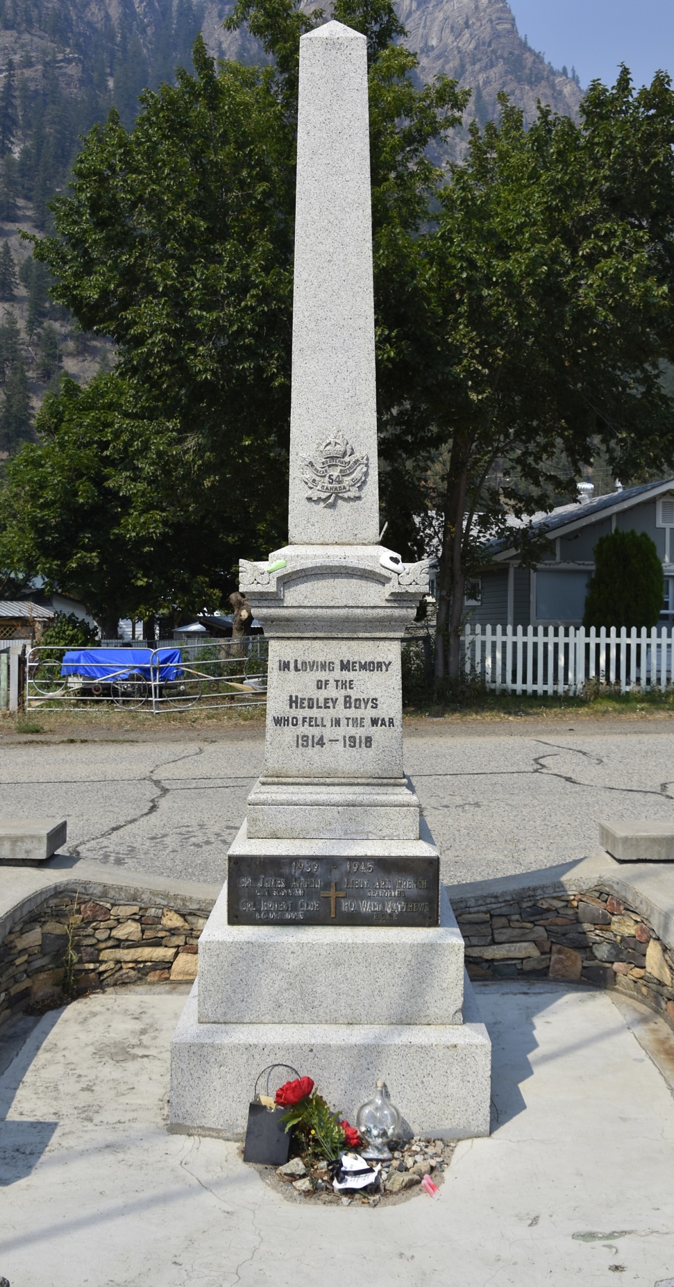Through the years the cenotaph has stayed in its same spot. Originally surrounded by railings, these were eventually removed after one too many car crashes endangered the monument, and a sturdy stone wall was built. A bronze plaque was later added at the base of the cenotaph with four names from the Second World War. On August 26, 2017, the Hedley Cenotaph was re-dedicated after restoration work in June 2017, to restore the lead lettering and add the names of two more men from Hedley who were killed in the First World War. Hedley residents, Jennifer Douglass and Andy English, devoted approximately three and a half years researching the names on the cenotaph and discovered the two names that should have been included. Repairs to the cenotaph were completed by stonemason Andrew Swinley.