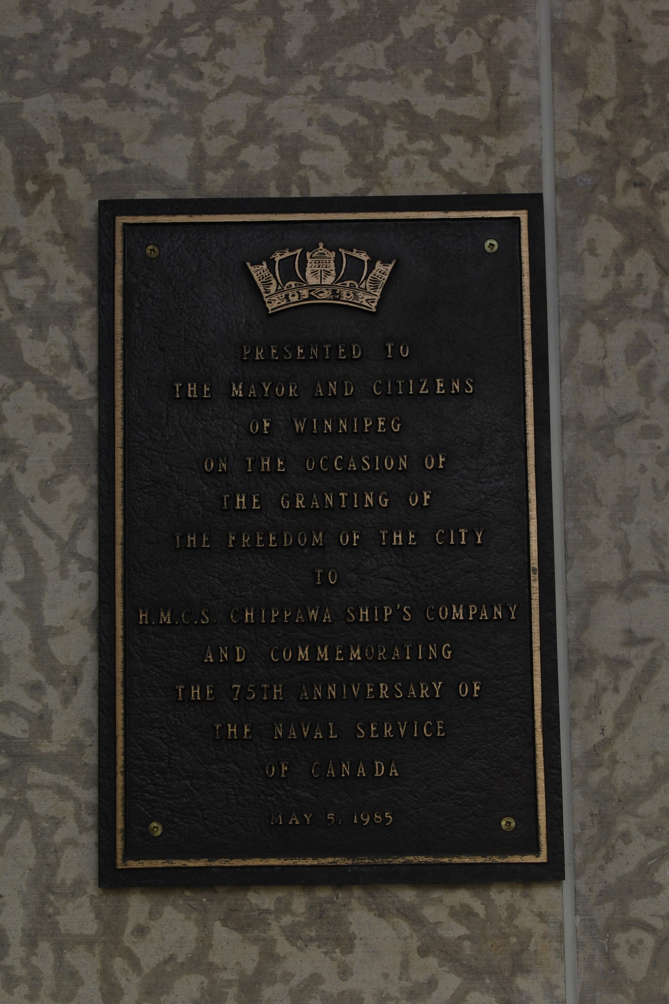 The HMCS Chippawa and Naval Service Plaque was erected on May 5, 1985 to honour the granting of the freedom of the city to HMCS Chippawa and the 75th anniversary of Naval Service.
