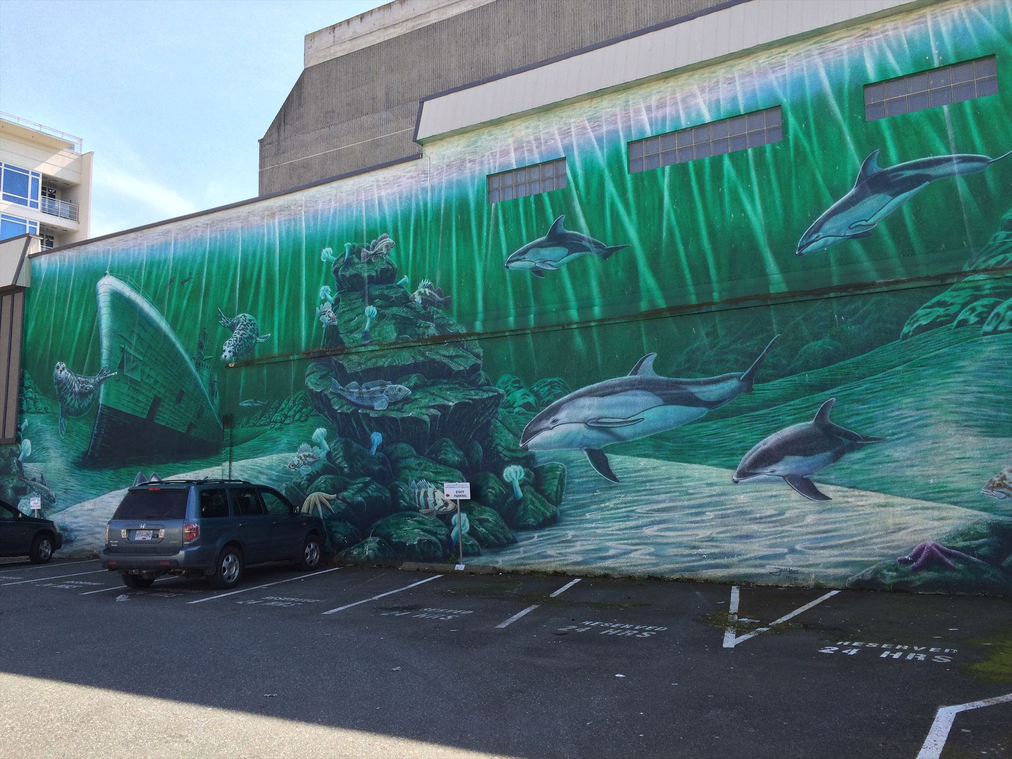 On June 14th, 1997 the HMCS Saskatchewan was sunk near Snake Island, just off Departure Bay, to start her new career as an artificial reef and dive spot. This mural, painted by Jeff King, is a tribute to the ship and the hard work put into the project by the Artificial Reef Society of BC.
