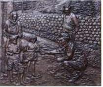 This sculpture, “IZZY DOLLS”, depicts a Canadian Combat Engineer, Master Corporal Mark Isfeld, presenting hand-knitted dolls made by his mother to Bosnian children in the zone of his unit’s operations. In the 1990s, MCpl Mark Isfeld was killed while clearing land mines on UN operations in Bosnia. This sculpture was erected in March 2013 by the Royal Military College of Canada, and is dedicated to current and past members of the Canadian Combat Engineers, in particular Master Corporal Mark Isfeld.