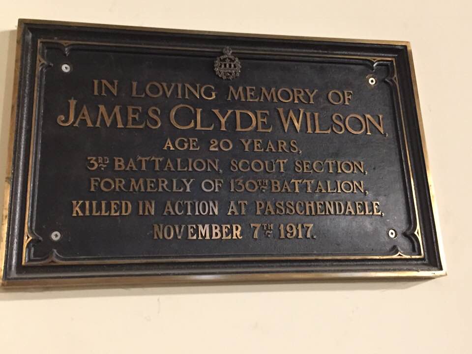 This memorial is dedicated to James Clyde Wilson. The cast bronze plaque is surmounted by the crest of III Battalion, Royal Regiment of Canada, Toronto.