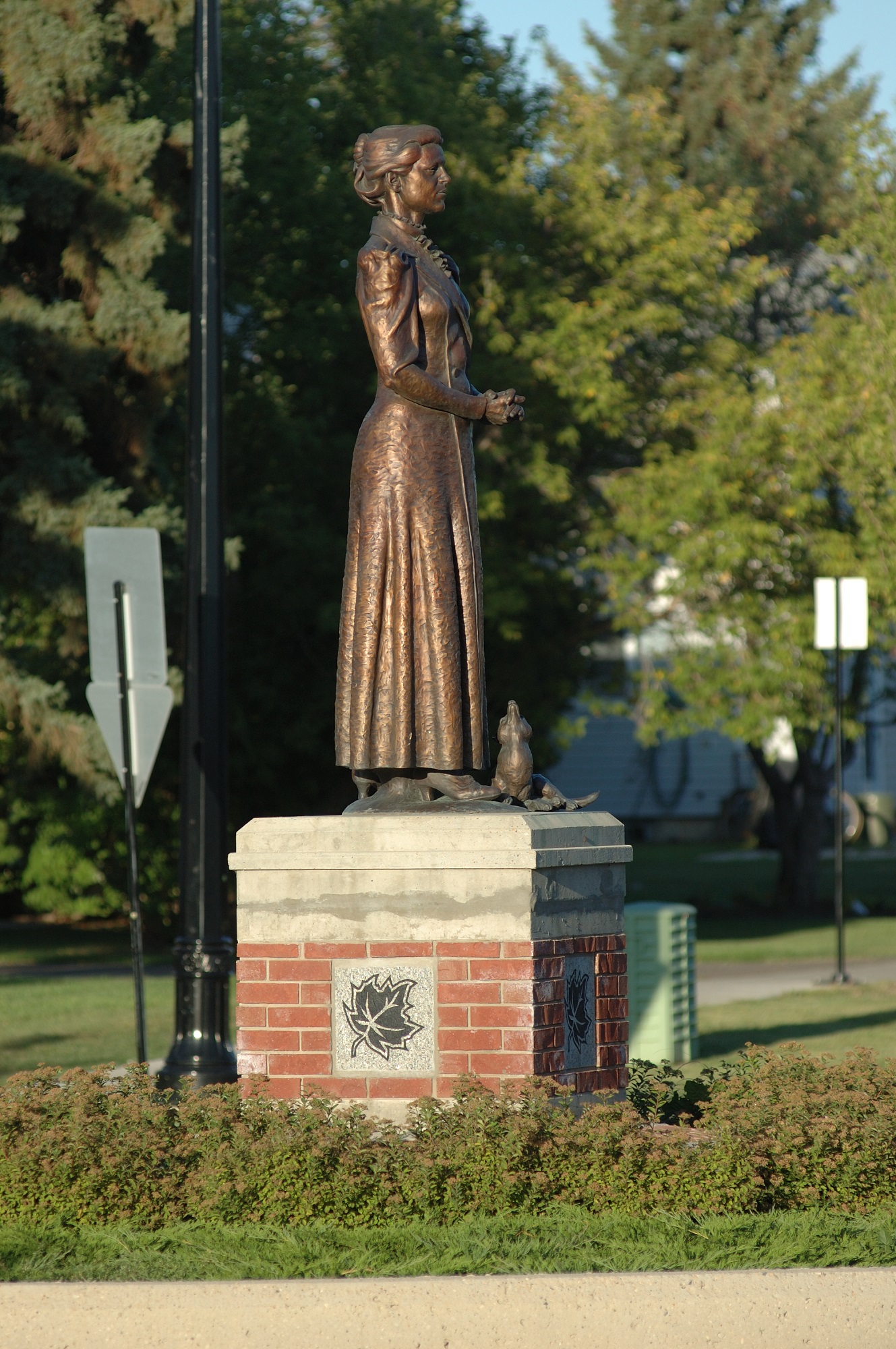 In January 1915, Lieutenant Colonel W.A. Griesbach began recruiting an infantry battalion from the Edmonton area to support Canada’s war effort. After five months training the 49th Battalion shipped out to England by train. During a brief stop at Lestock, Saskatchewan, the Battalion was presented with a coyote pup, who was promptly adopted as the battalion’s mascot. Lestock, as the pup was named, accompanied the battalion to England where he was a favorite with Mrs. Janet Griesbach and the training soldiers. The statue of Janet Griesbach features Lestock curled up at her feet. When the battalion left for France, Lestock was given to London’s Regents Park Zoo where he lived for many years. The badge of The Loyal Edmonton Regiment – the 49th Battalion, still features Lestock, the Coyote, and the windmill of Flanders.