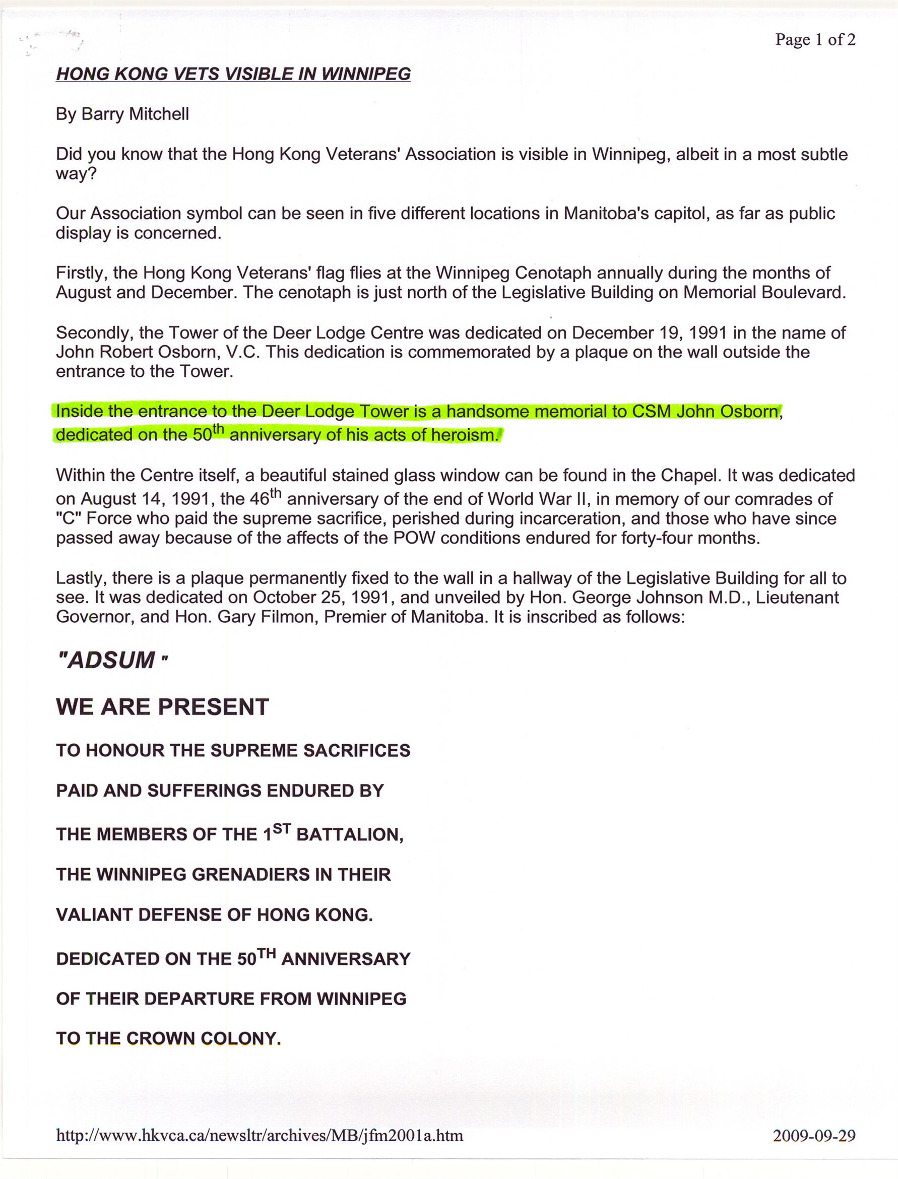 The John Robert Osborn VC Memorial, was dedicated on December 19, 1991 by his comrades to celebrate the 50th anniversary of his acts of heroism. The memorial made of three different types of granite interlocked together, was designed, manufactured and installed by Brunet Monuments. (Refer to memorial number 46010-053.)
