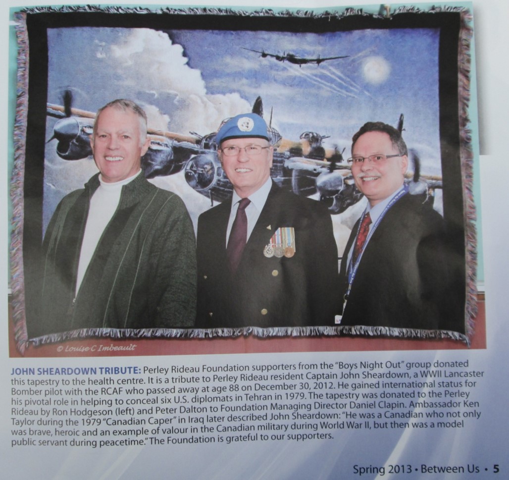 The tapestry was donated to the Perley Rideau by Ron Hodgeson and Peter Dalton to the foundation Managing Director Daniel Clapin. Ambassador Ken Taylor during the 1979 "Canadian Caper" in Iraq later described John Sheardown: "He was a Canadian who not only was brave, heroic and an example of valour in the Canadian military during the Second World War, but then was a model public servant during peacetime."