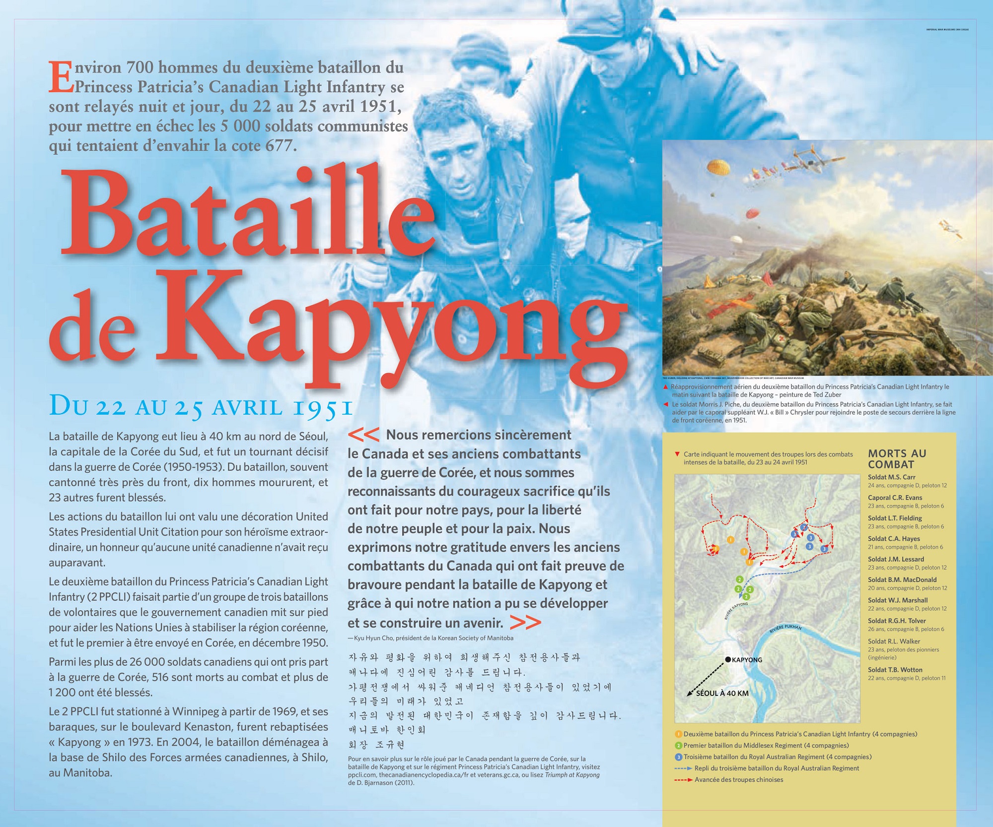 La bataille de Kapyong eut lieu à 40 km au nord de Séoul, la capitale de la Corée du Sud, et fut un tournant décisif dans la guerre de Corée (1950-1953). Du bataillon, souvent cantonné très près du front, dix hommes moururent, et 23 autres furent blessés.