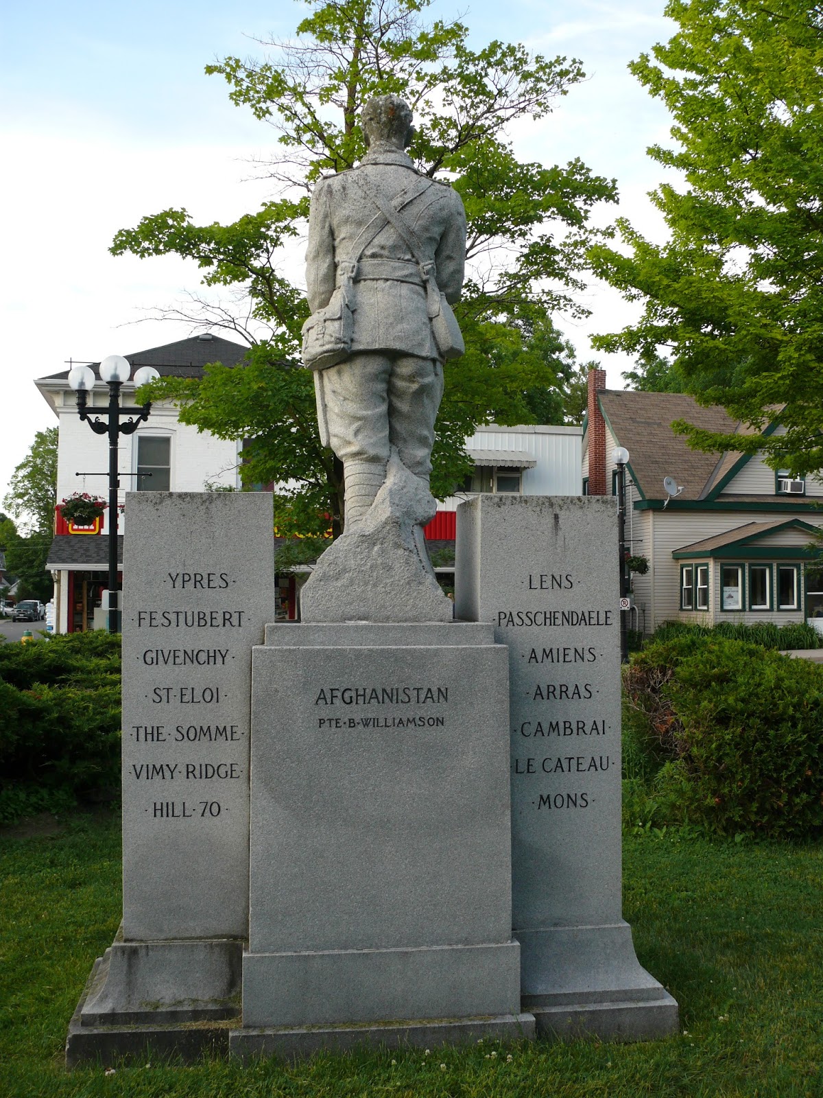 History of the Kemptville Cenotaph - Author Roy Brown - ''The Kemptville Cenotaph honours local military personnel who paid the supreme sacrifice, and those that served, during (the First and Second World Wars), Korea and most recently, Afghanistan. The Kemptville Cenotaph was fabricated in 1921, using seven separate blocks of Stanstead grey granite from the Beebe, Quebec quarry and includes the statute of a young soldier, bases and shafts.